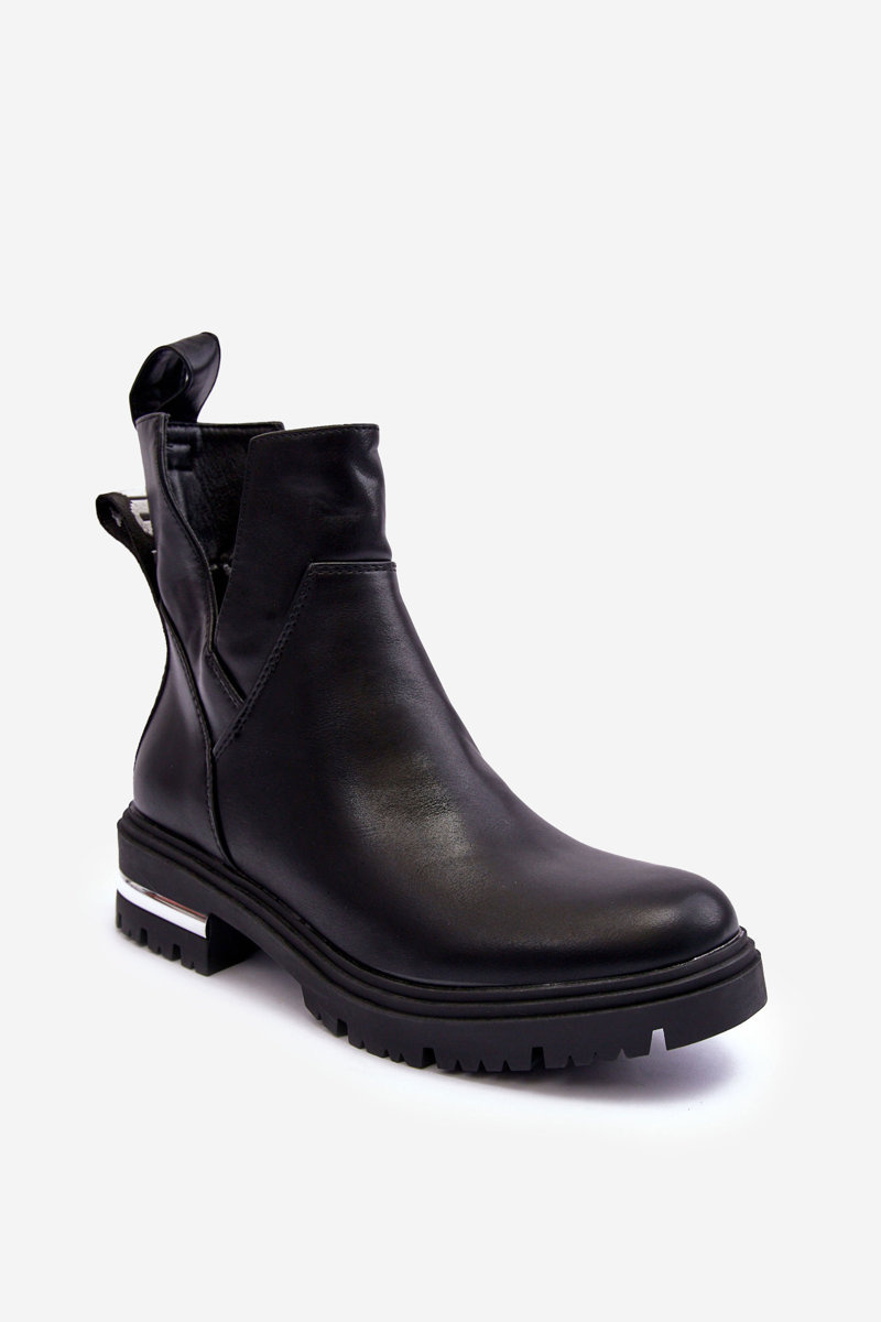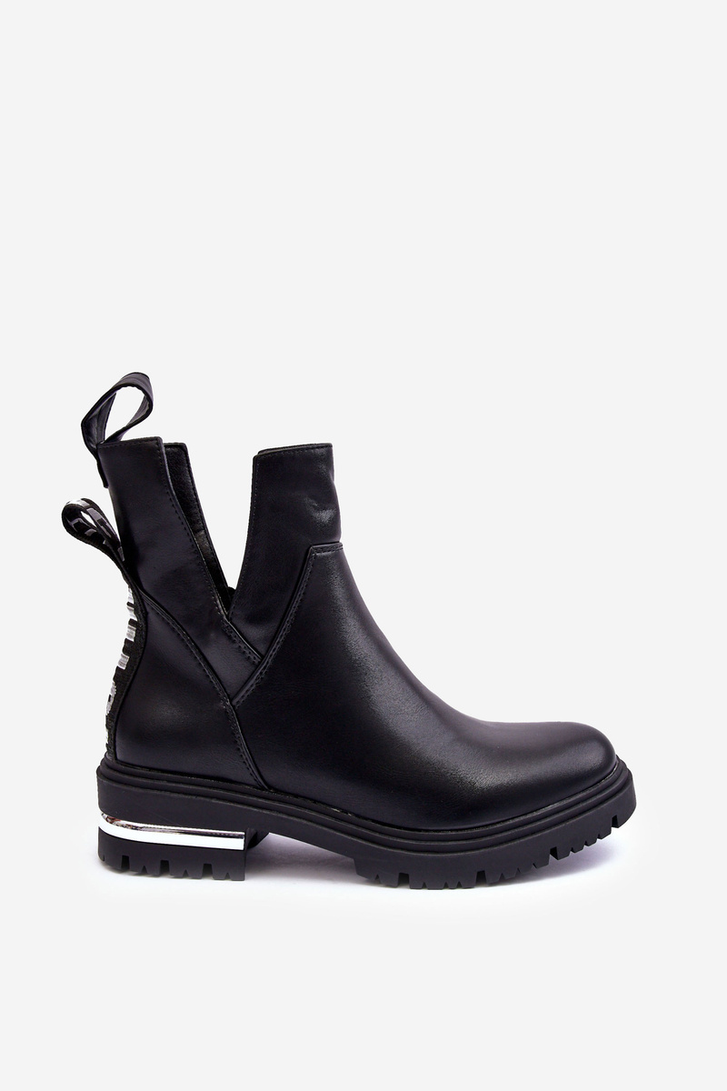 Dámské boty s plochou podpatku. Vyrobeno z eko kůže. Uvnitř je zateplený obuvní kožešinou. Horní část s vyřezávanými stranami. Na podpatku zrcadlová ozdoba. Špička je zaoblená. Tento model má na zadní straně cholewki nápis. Kromě toho je patka zesílená. Při výběru velikosti se řiďte tabulkou velikostí.