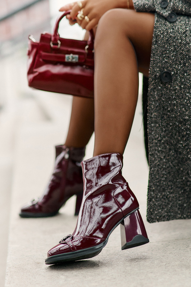 Dámské boty vyrobené z lakované eko kůže jsou stylovou volbou pro chladnější dny. Usazené na stabilním sloupkovém podpatku, dodávají siluetě eleganci a moderní vzhled. Model má čtvercové špičky a ozdobu vpředu, která podtrhuje módní charakter. Zateplené obuvnickou vlnou, zajišťují pohodlí a teplo, a zapínání na zip usnadňuje rychlé obutí. Ideální pro elegantní a výstřední styling. Při výběru velikosti se řiďte tabulkou velikostí.