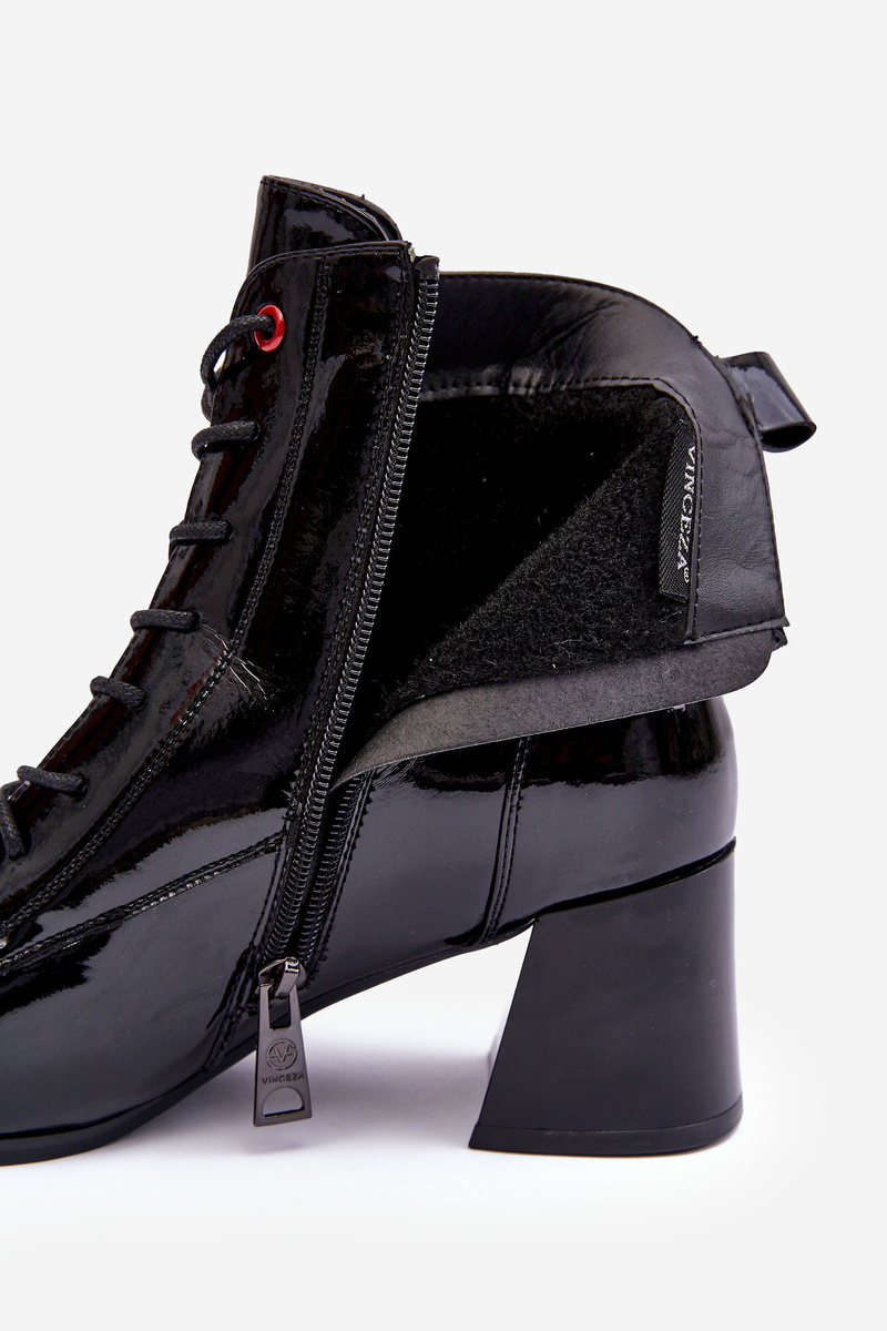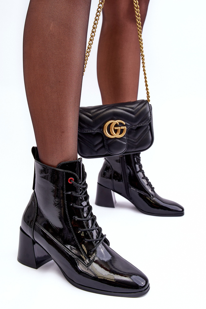 Lakované dámské boty vyrobené z eko kůže. Upevněné na sloupku. Tento model je uzavřen na zip po straně a také má šněrování. Špička je zesílena. Špičky jsou zaoblené. Ideální pro jarní-podzimní sezónu. Při výběru velikosti se řiďte tabulkou velikostí.