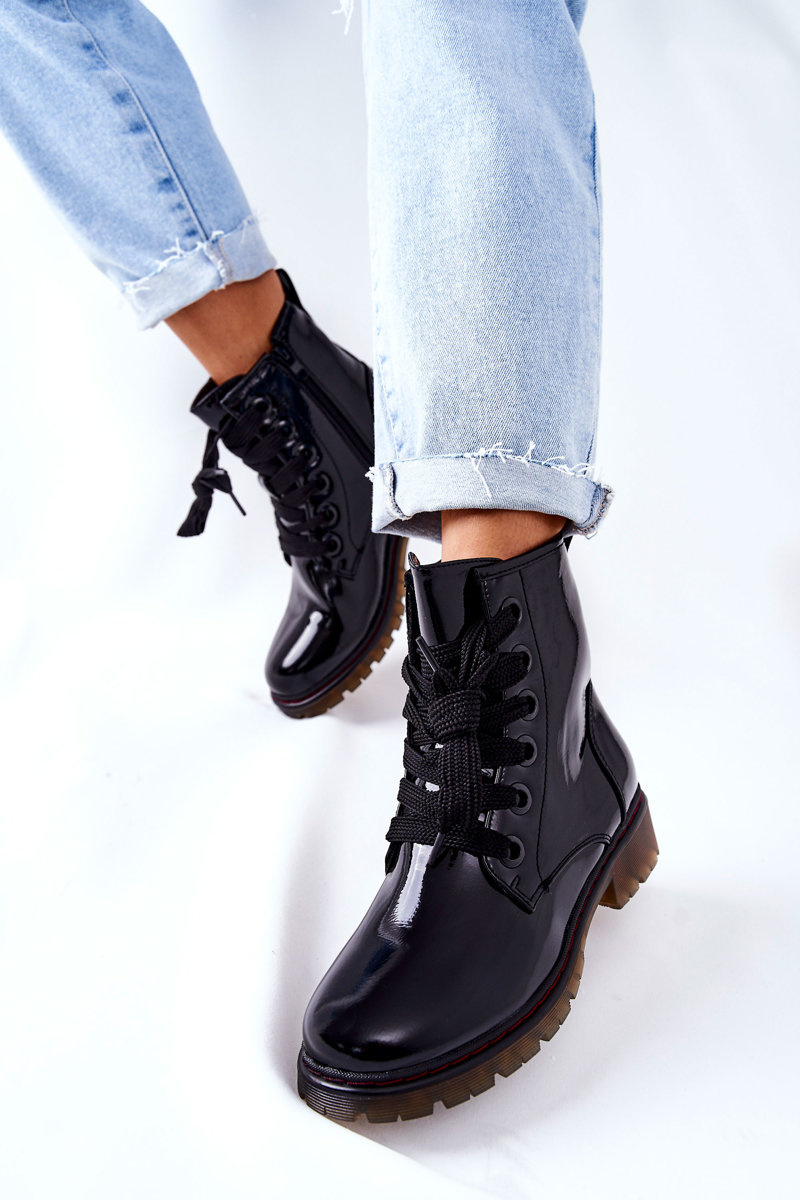 Módní boty z lakované ekologické kůže. Boty mají zip na boku svršku a vázání pro snadné obouvání. Vnitřní prostor je zateplen měkkou přikrývkou na boty. Ozdobné prošívání na podrážce. Nečekejte, až zmizí! Při výběru velikosti se řiďte tabulkou velikostí.