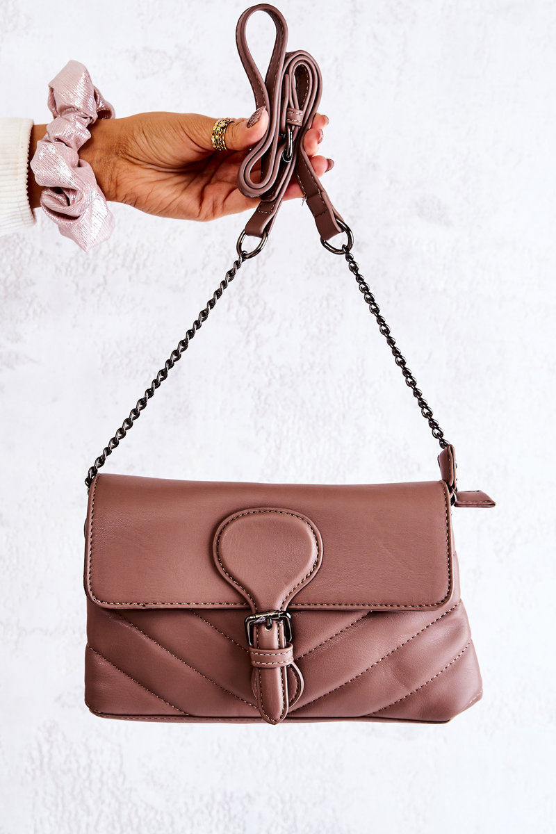 Módní prošívaná taška z ekologické kůže. Klopa tašky se uzavírá na magnet s ozdobnou sponou. Přihrádky na zip. Uvnitř je jedna otevřená kapsa a jedna kapsa na zip. Taška je vybavena nastavitelným popruhem z kovového řetízku a ekologické kůže ve stejné barvě. Nezapomeňte si prohlédnout celou naši kolekci kabelek!