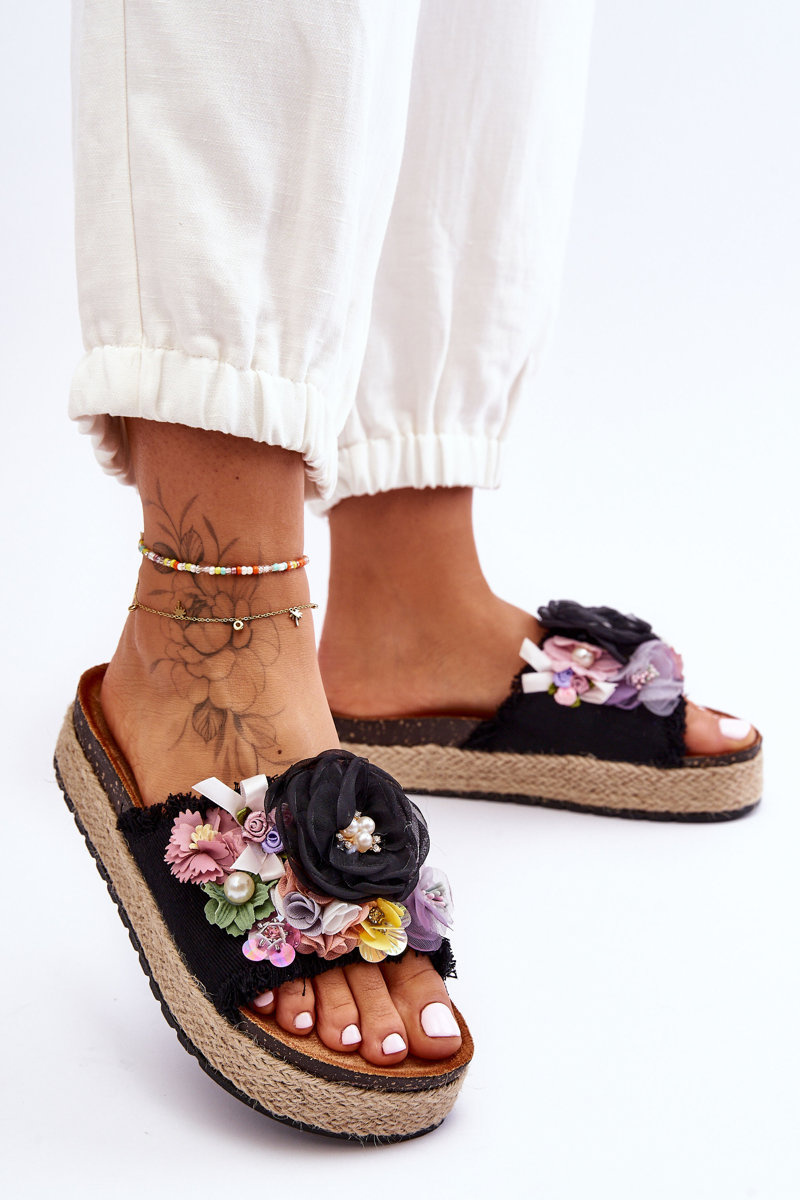 Jedinečné, dámské pantofle s nádherným zdobením v podobě látkových květin a perliček. Nasazené na masivní platformě zdobené jutovým prýmkem. Pantofle mají profilovanou, eko semišovou stélku. S tímto modelem budete jistě vyčnívat z davu! Při výběru velikosti se prosím řiďte tabulkou velikostí.