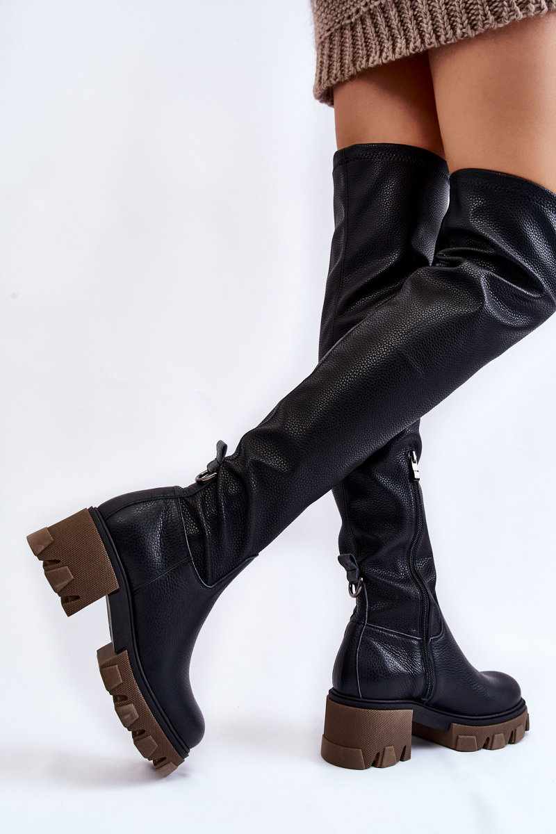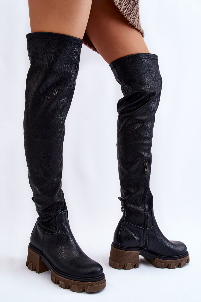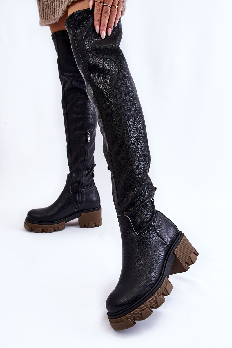 Jedinečné stehenní boty jsou vyrobeny z vysoce kvalitní přírodní kůže. Nazouvací model s bočním zipem. Kozačky jsou nasazeny na masivním podpatku a platformě s drážkami. Podpatek je vyztužený. Uvnitř byly ve výšce nohy zatepleny dekou, ve zbývající výšce látkou. Při výběru velikosti použijte tabulku velikostí.