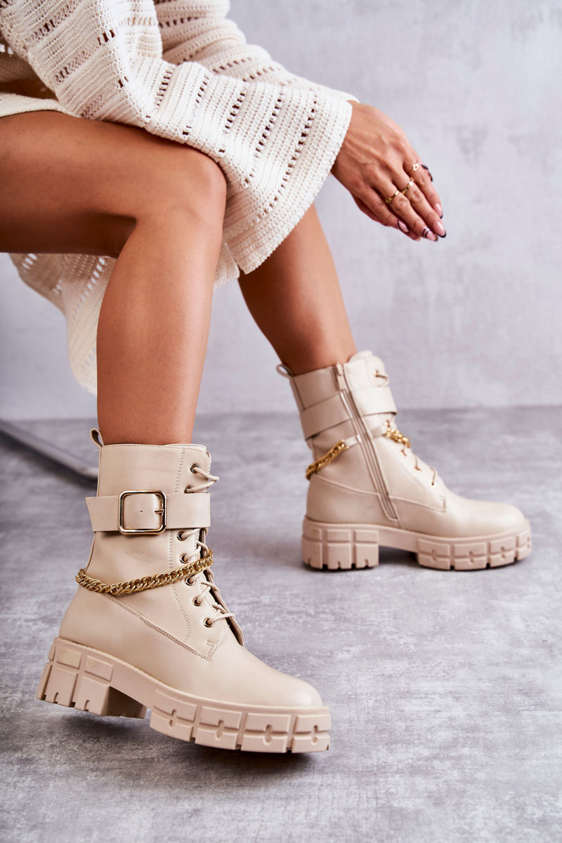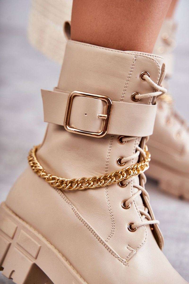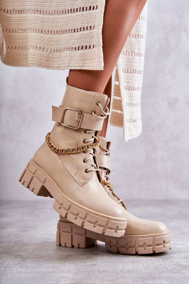Neobvyklé a stylové kozačky vyrobené z eko kůže. Svršek na zip a šněrování na boku. Navíc mají boty nastavitelný pásek s přezkou. Ozdobný řetízek je připevněn ke svršku a není stažen. Boty jsou vyrobeny z eko kůže. Mají izolaci v podobě přikrývky na obuv. Jsou osazeny na masivním plochém podpatku a platformě. Při výběru velikosti použijte tabulku velikostí.