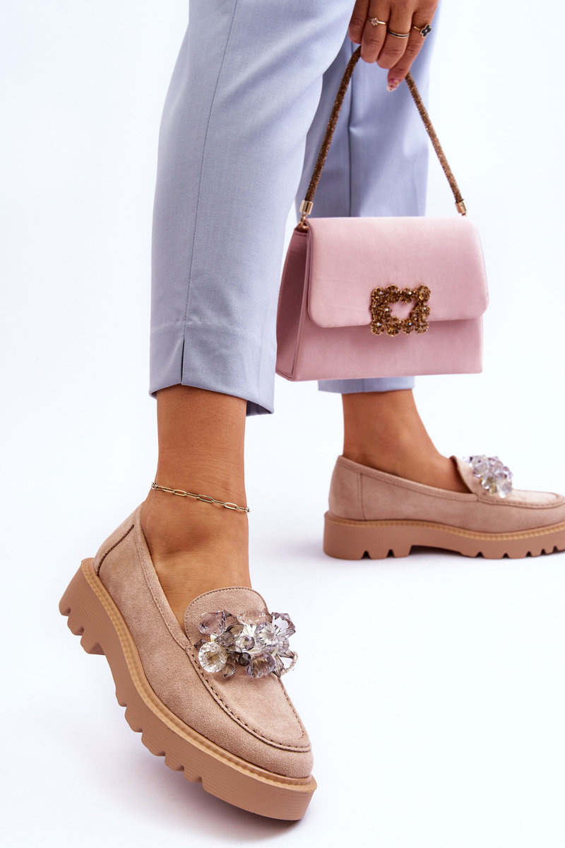 Perfektní obuv pro sezónu jaro-léto! Dámské mokasíny jsou vyrobeny z vysoce kvalitního eko semiše. Mají zdobení v podobě krystalů. Mokasíny byly postaveny na platformě a plochém podpatku s drážkami. Pohodlná stélka z přírodní kůže zajistí pohodlí při používání. Boty mají také vyztužený podpatek. Při výběru velikosti se řiďte tabulkou velikostí.
