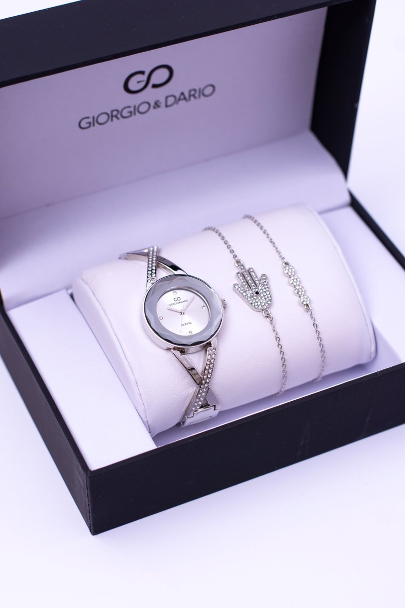 Elegantní a extrémně stylová sada od společnosti Giorgio & Dario. Stříbrné hodinky zdobené drobnými krystaly a dvěma jemnými náramky. Tato sada vás jistě osloví, perfektní dárek! Vše na obrázku - hodinky, dva náramky a balení.