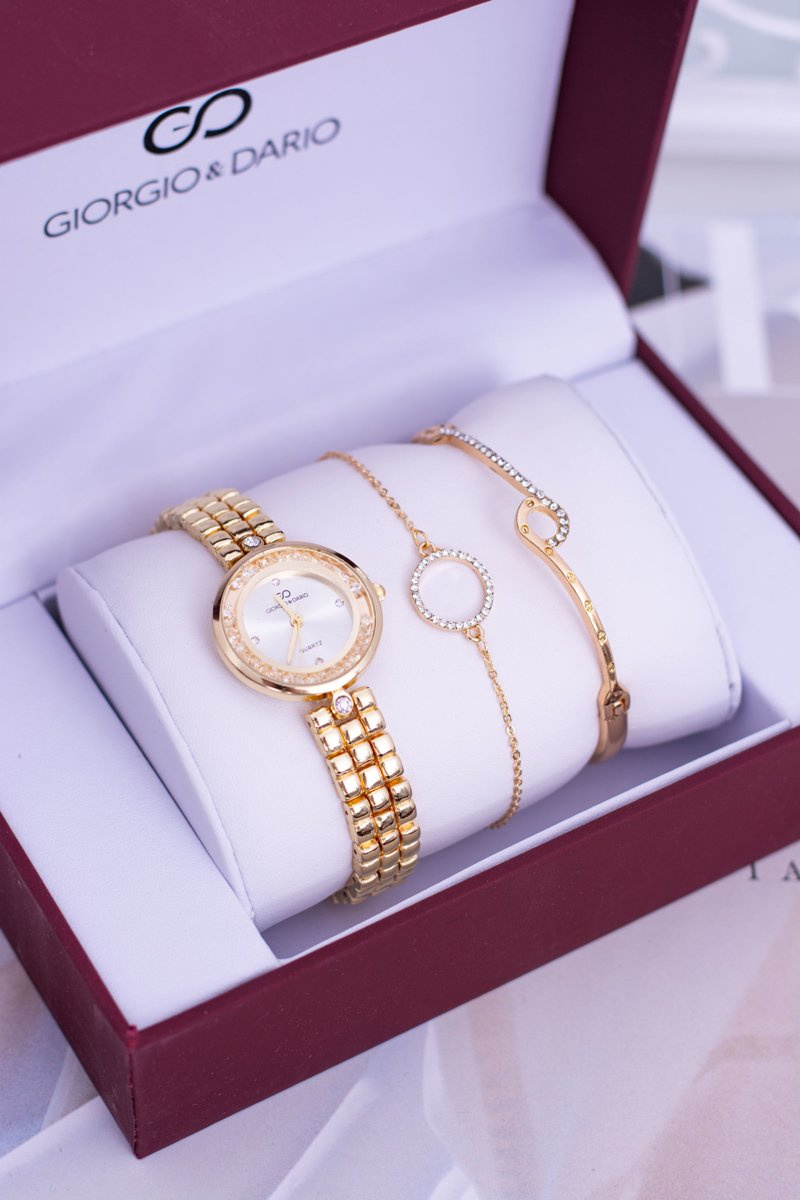 Neobyčejná sbírka hodinky Giorgio Dario, která dokonale zvýrazní vaši jedinečnost! Delikátní ozdoba ve formě zlaté hodinky s kubickým zirkonem a dvěma krásnými náramky. Sada obsahuje vše, co je na obrázku, tj. Hodinky, dva náramky a balení.