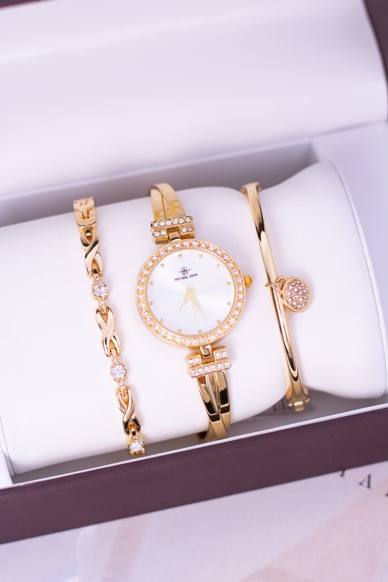 Nastavte Michael John zlaty dámské hodinky se zirkony dva náramky