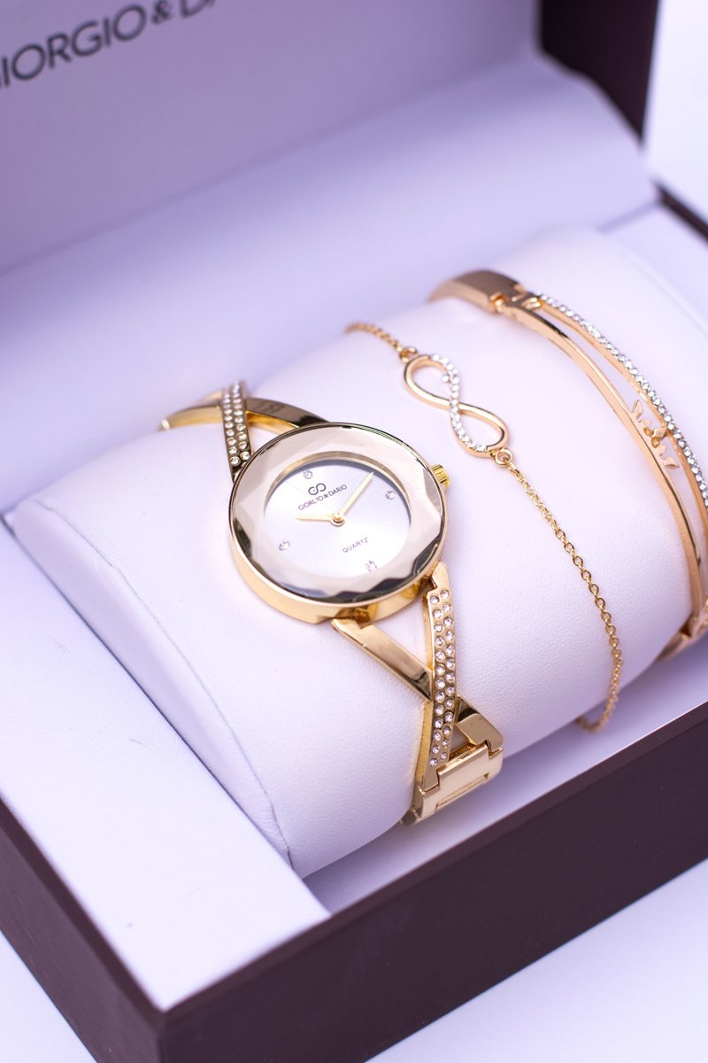 Elegantní a extrémně stylová sada od společnosti Giorgio & Dario. Zlaté hodinky zdobené drobnými krystaly a dvěmi štýlovými náramky. Tato sada vás jistě osloví, perfektní dárek! Nabídka obsahuje vše, co je na obrázku, tj. Hodinky, dva náramky a balení.