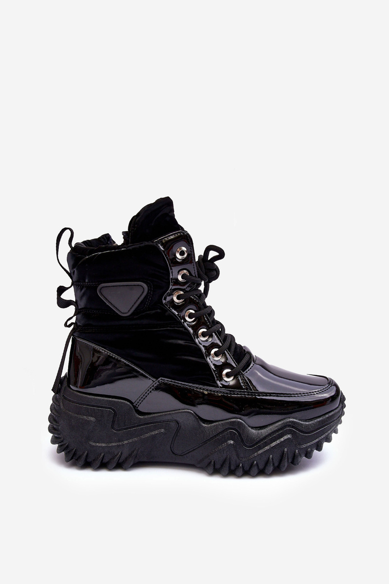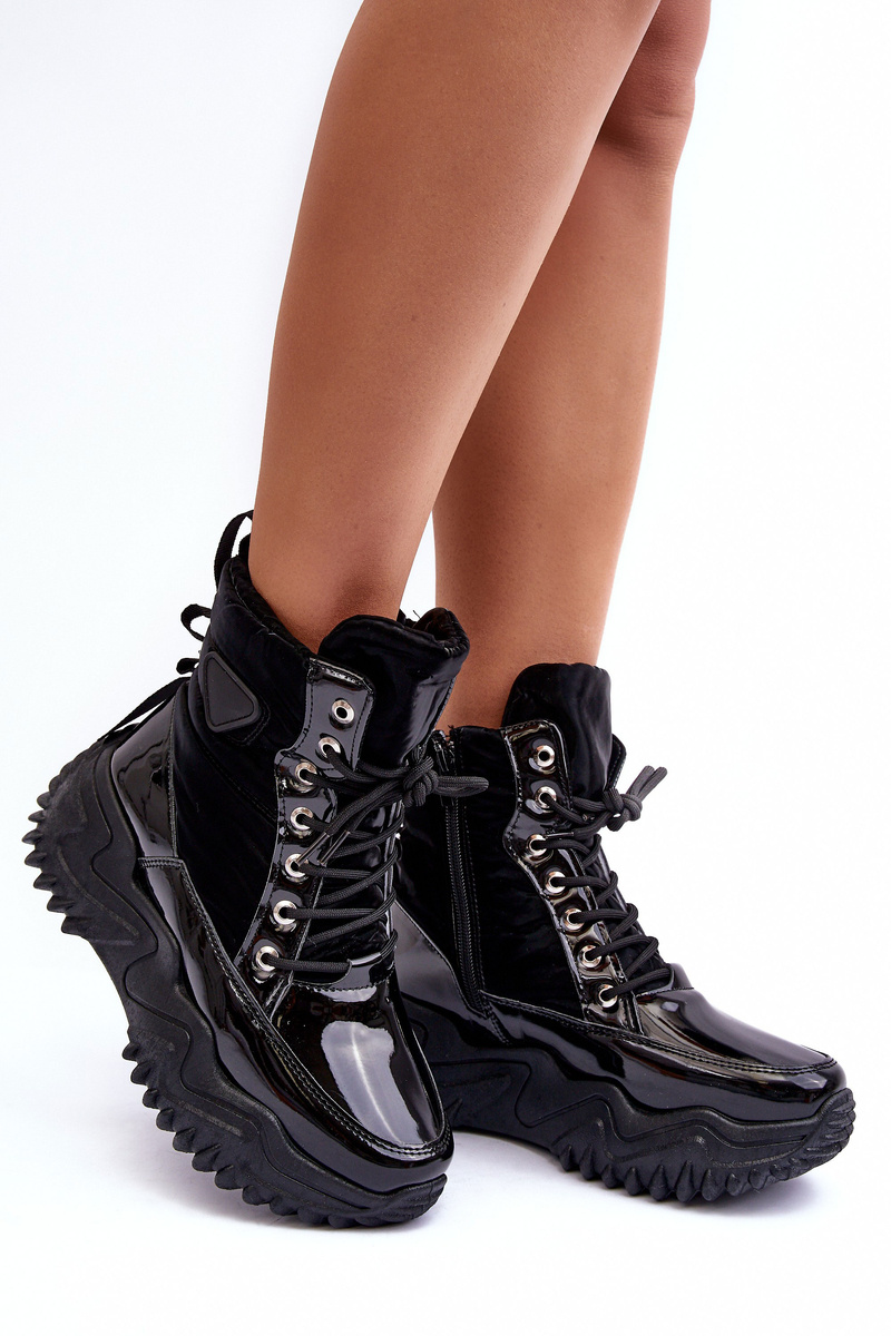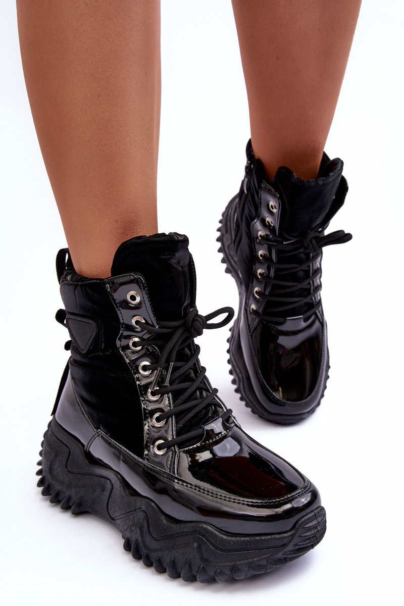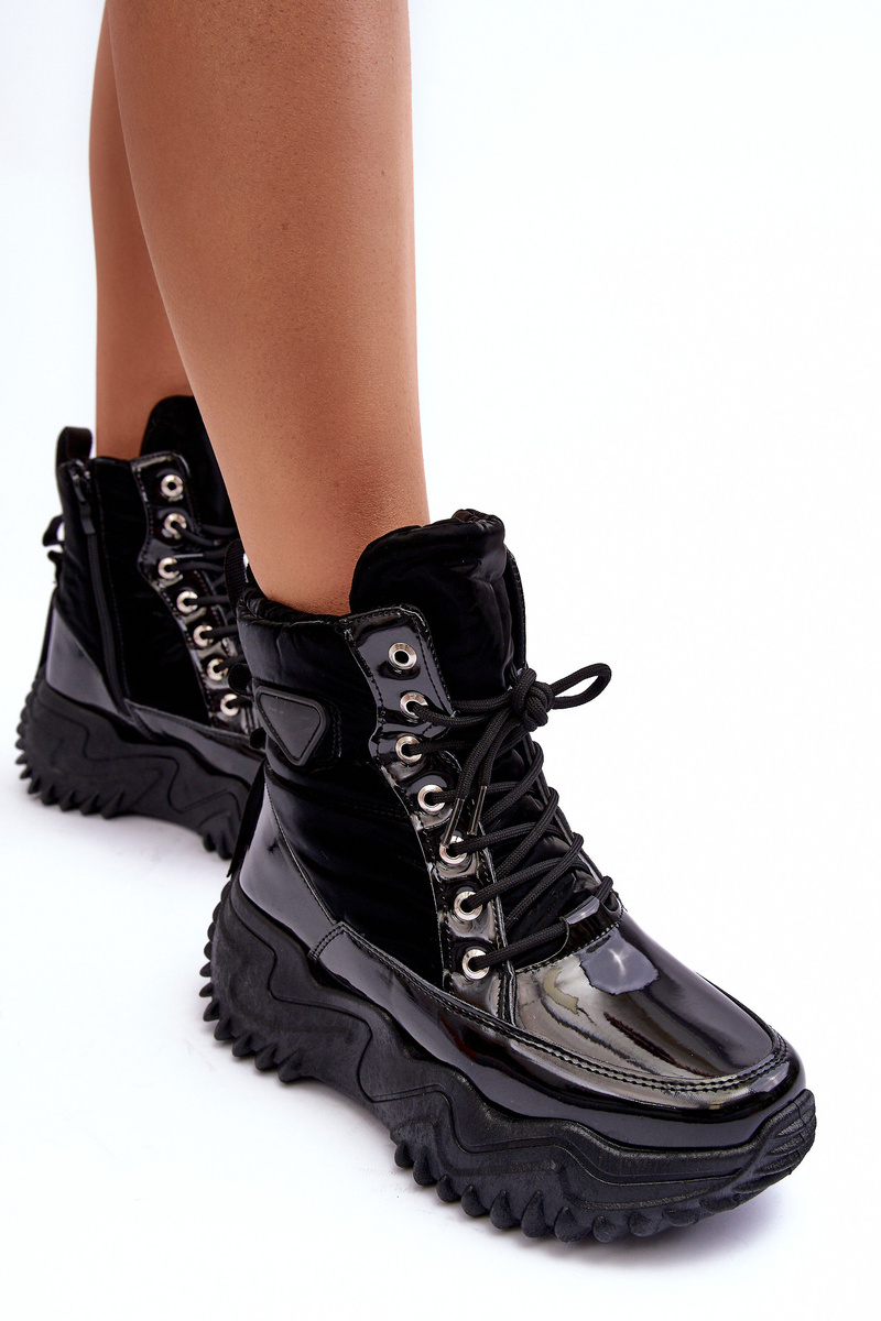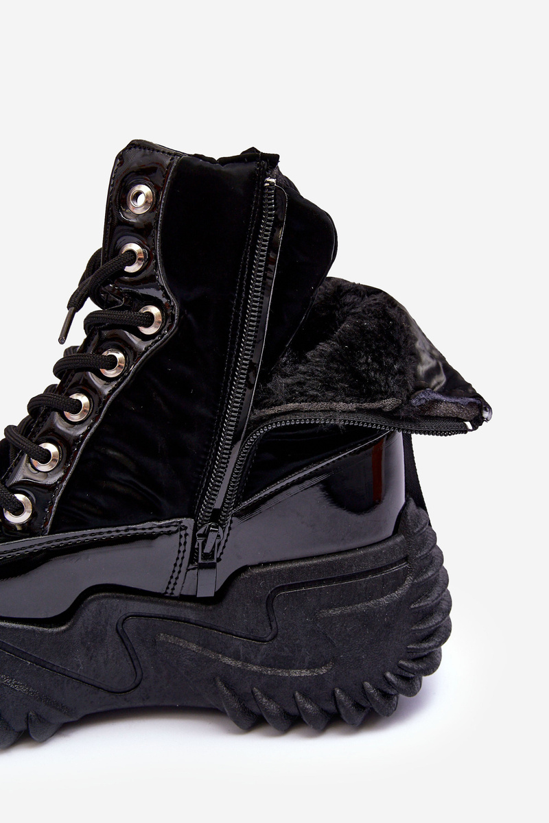 Boty dámské ve sportovním stylu. Umístěné na masivní platformě. Uvnitř je teplé a příjemné na dotek kožešiny. Zapínání na zip po vnitřní straně kotníku a navíc šněrované. Boty budou ideální pro zimní dny! Při výběru velikosti se řiďte tabulkou velikostí.