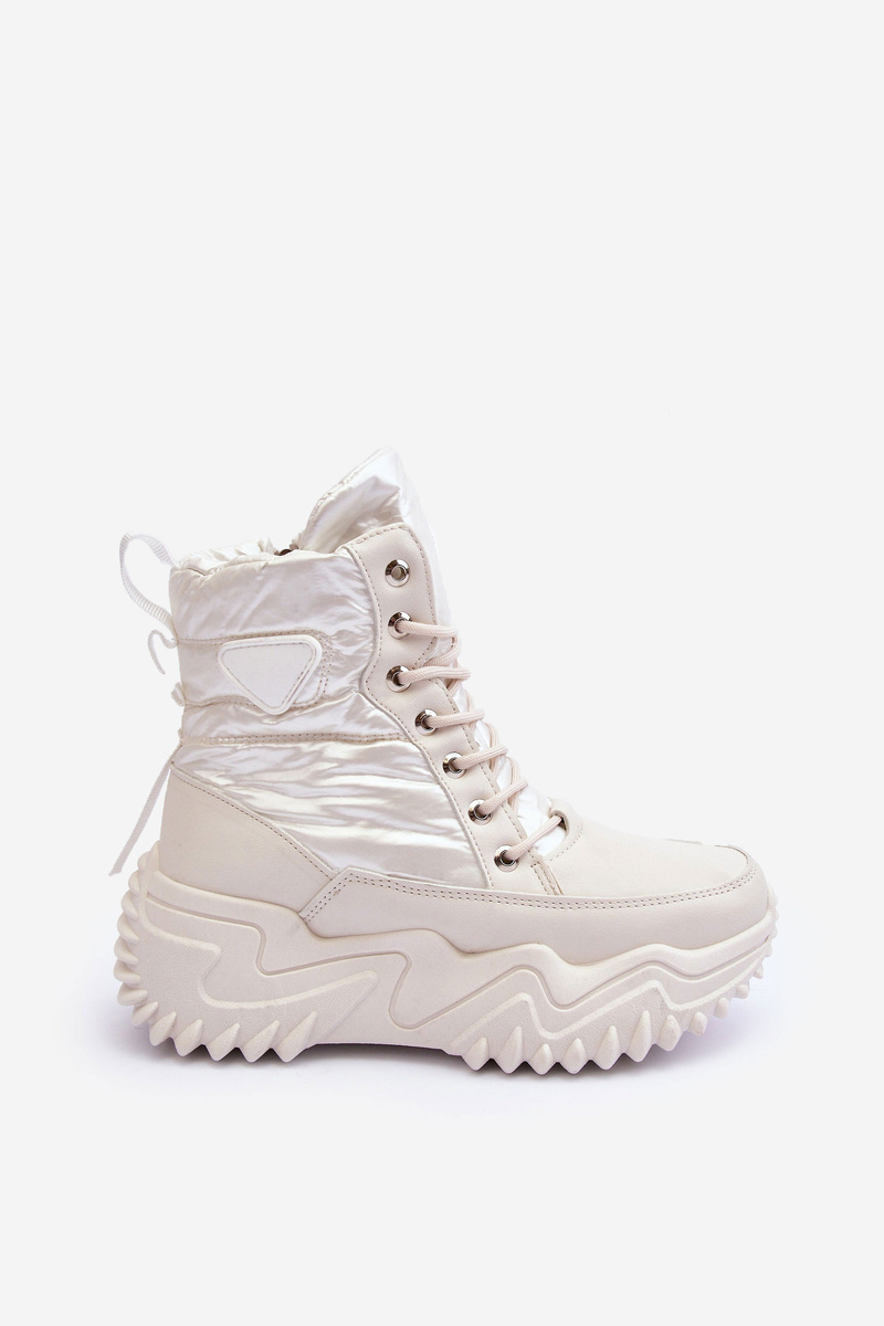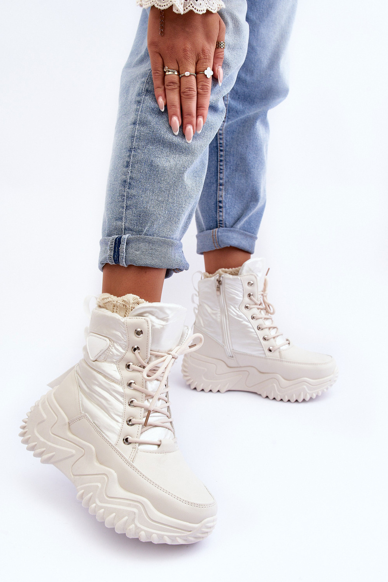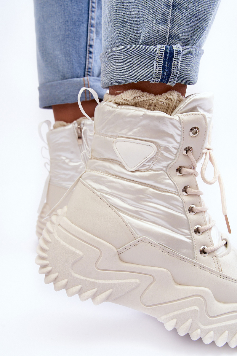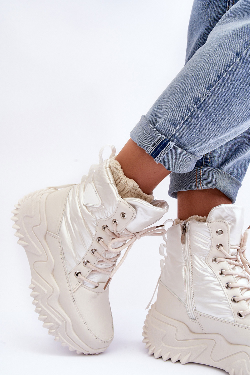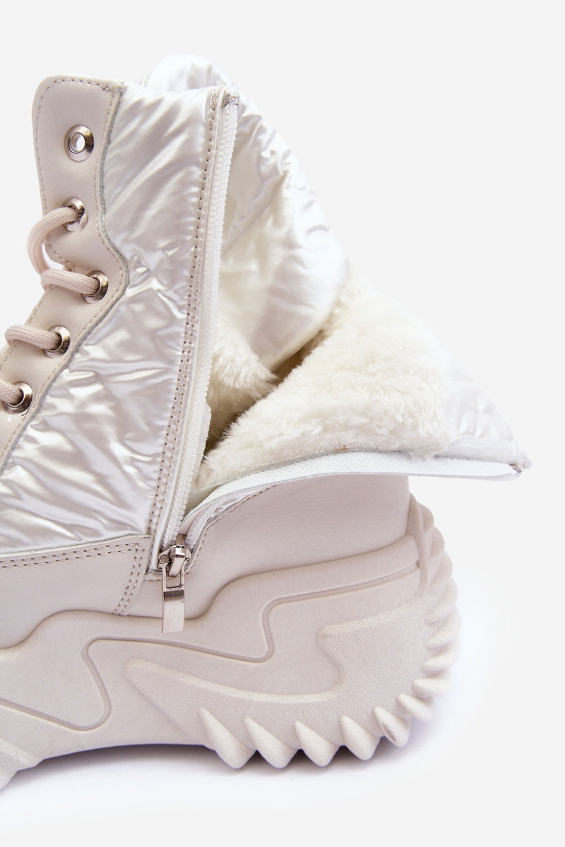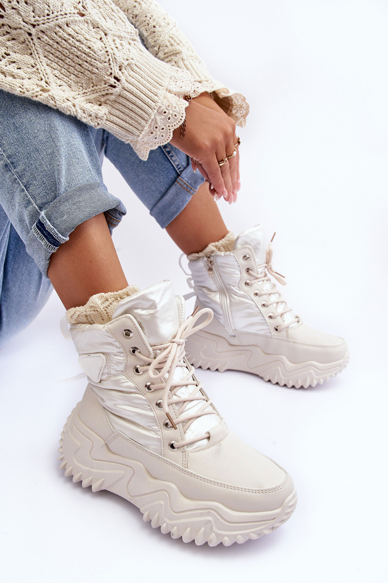 Boty dámské ve sportovním stylu. Umístěné na masivní platformě. Uvnitř je teplé a příjemné na dotek kožešiny. Zapínání na zip po vnitřní straně kotníku a navíc šněrované. Boty budou ideální pro zimní dny! Při výběru velikosti se řiďte tabulkou velikostí.