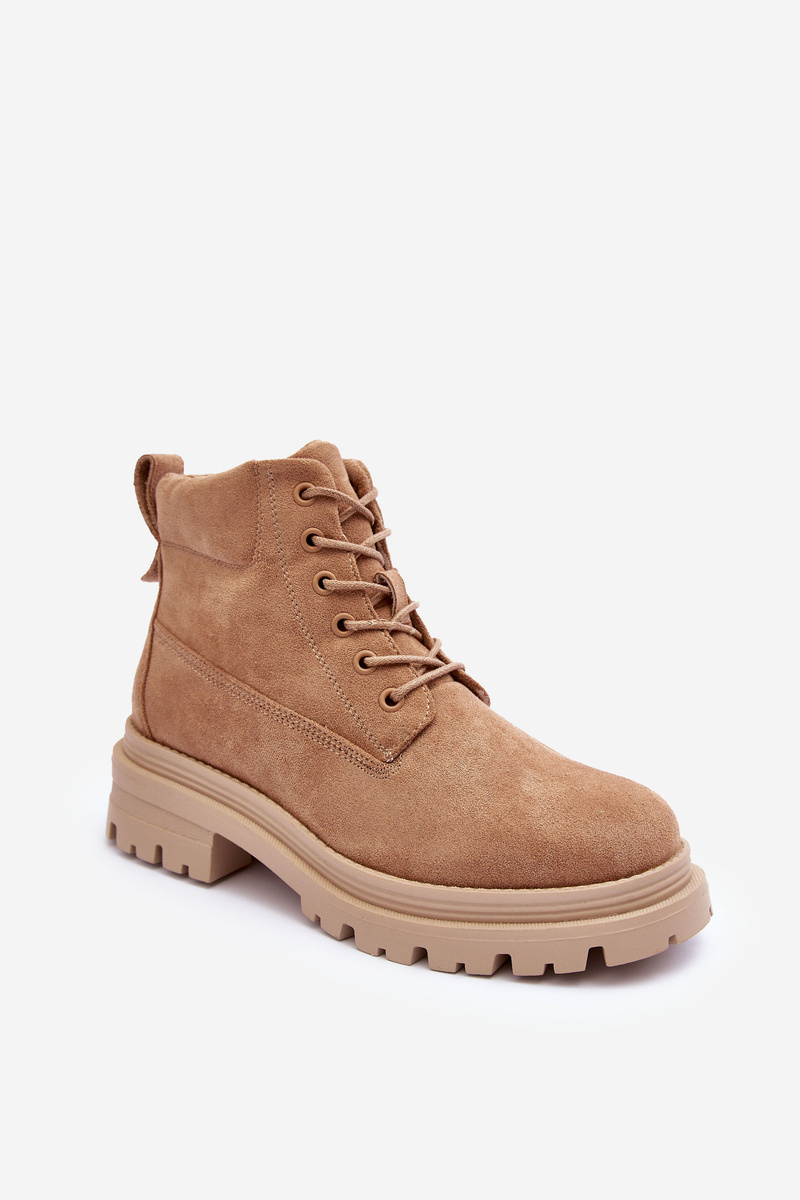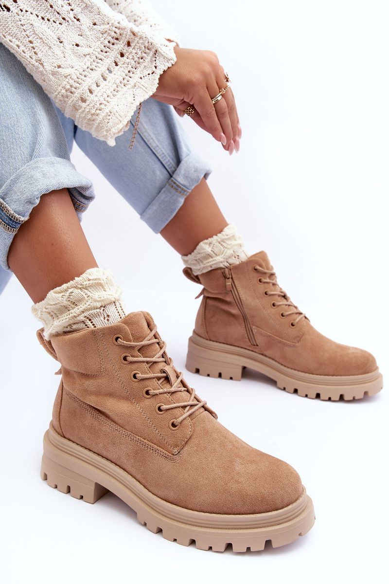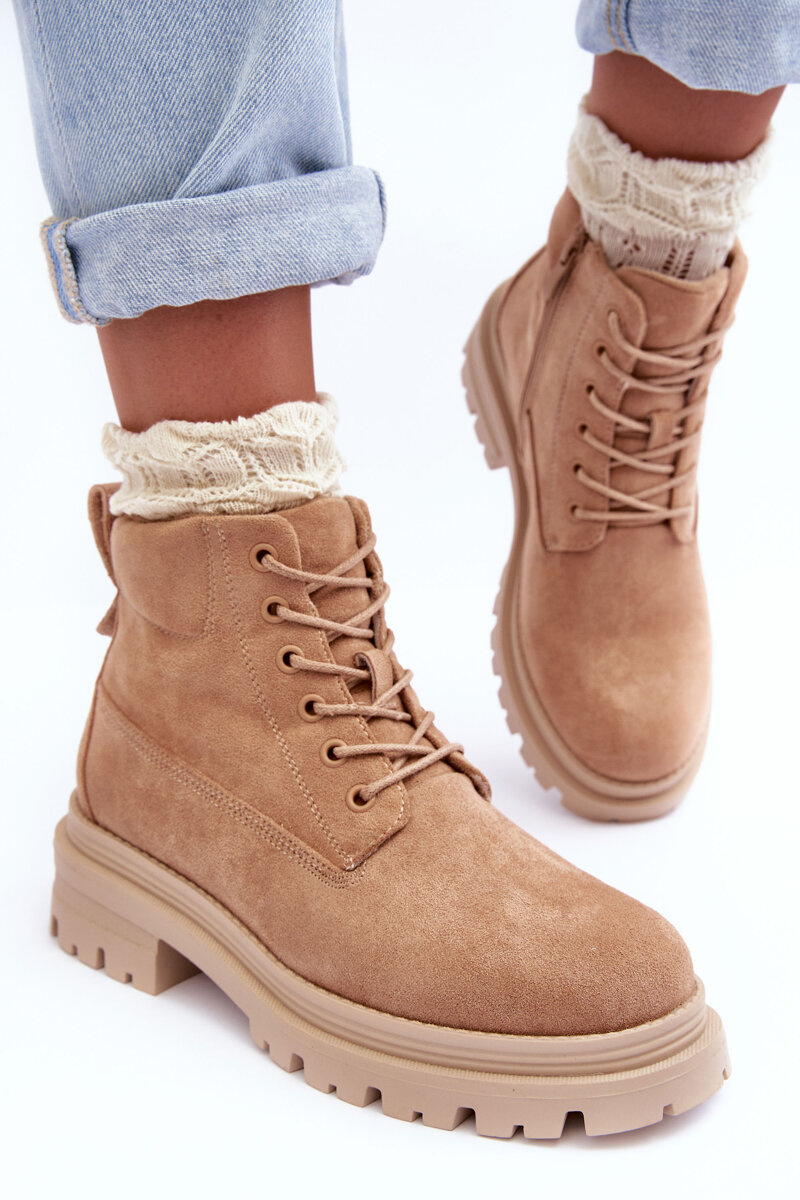 Dámské trekové boty vyrobené z ekologického semiše. Osazené na ploché, stabilní podpatku a platformě. Uvnitř je teplé a příjemné na dotek kožešiny. Zip a také šněrování. Pevný špička. Tyto boty jsou ideální pro zimní dny! Při výběru velikosti se řiďte tabulkou velikostí.