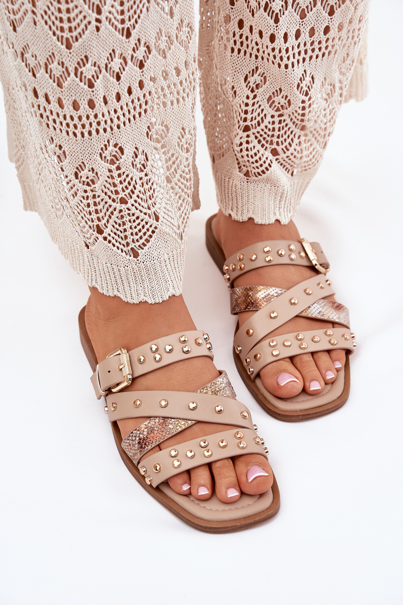 Ozdobené dámské sandály na plochém podpatku se pásky a sponou béžové Manitte