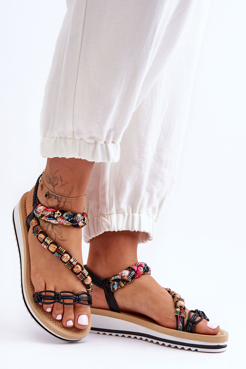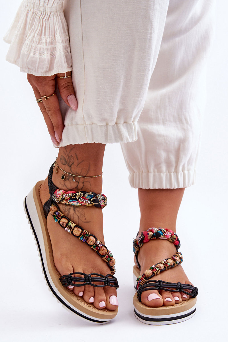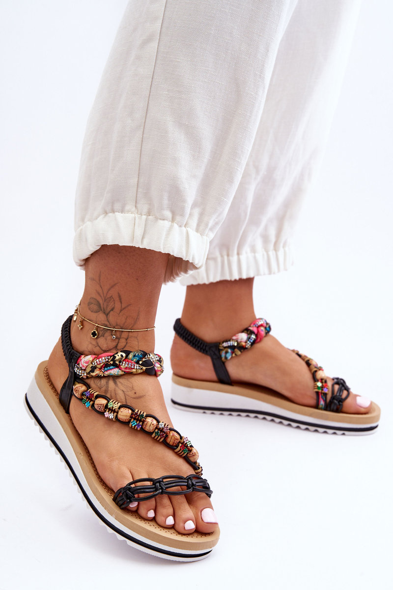 Módní dámské sandály byly namontovány na klínu a platformě. Tento model byl vyroben z kombinace eko kůže a látky. Sandály mají na páscích ozdoby v podobě kamínků a korálků. Měkká pěnová stélka zajistí pohodlné nošení obuvi. Sandály se nazouvají. Tento model by neměl chybět ve vašem šatníku! Při výběru velikosti se řiďte tabulkou velikostí.