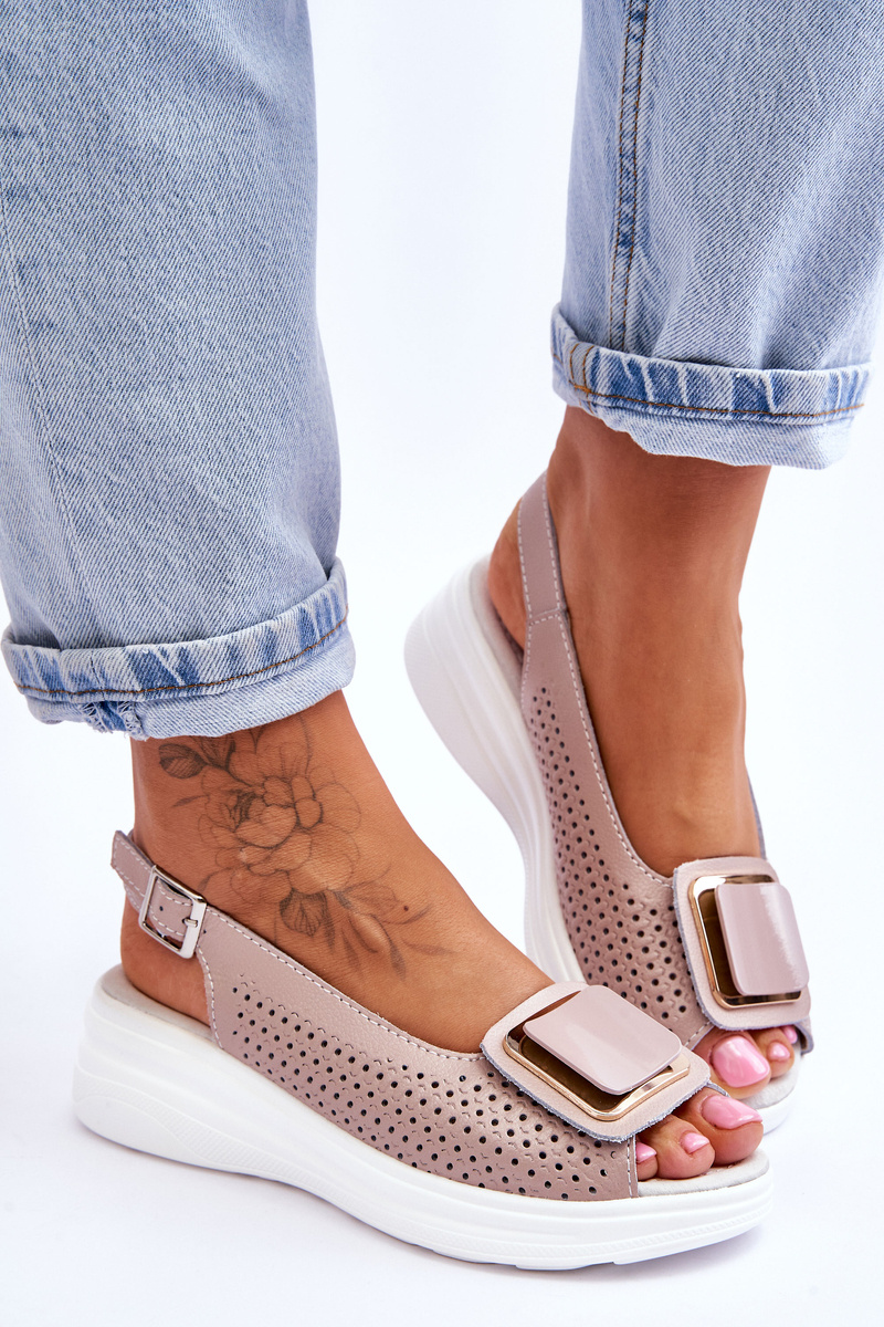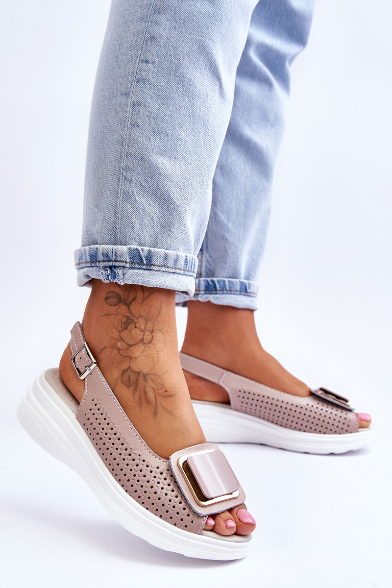 Mimořádně pohodlné dámské sandály jsou vyrobeny z vysoce kvalitní přírodní kůže. Tento model se zapíná pomocí nastavitelného popruhu s přezkou. Sandály jsou vzdušné, díky ažurovému vzoru. Pohodlné používání zajistí měkká stélka z přírodní kůže. Sandály byly nasazeny na klínovém podpatku a platformě. Na přední straně je ozdobný prvek z plastu. Při výběru velikosti se prosím řiďte tabulkou velikostí.