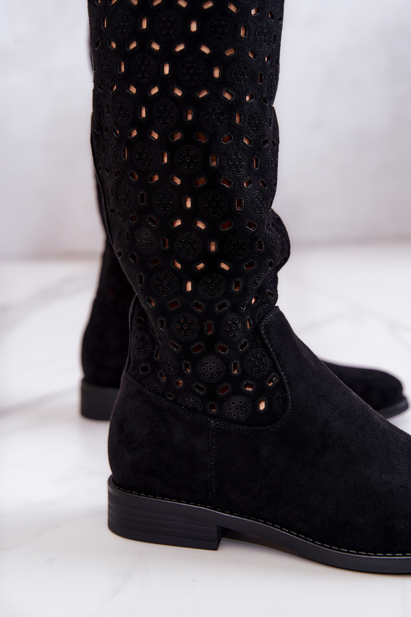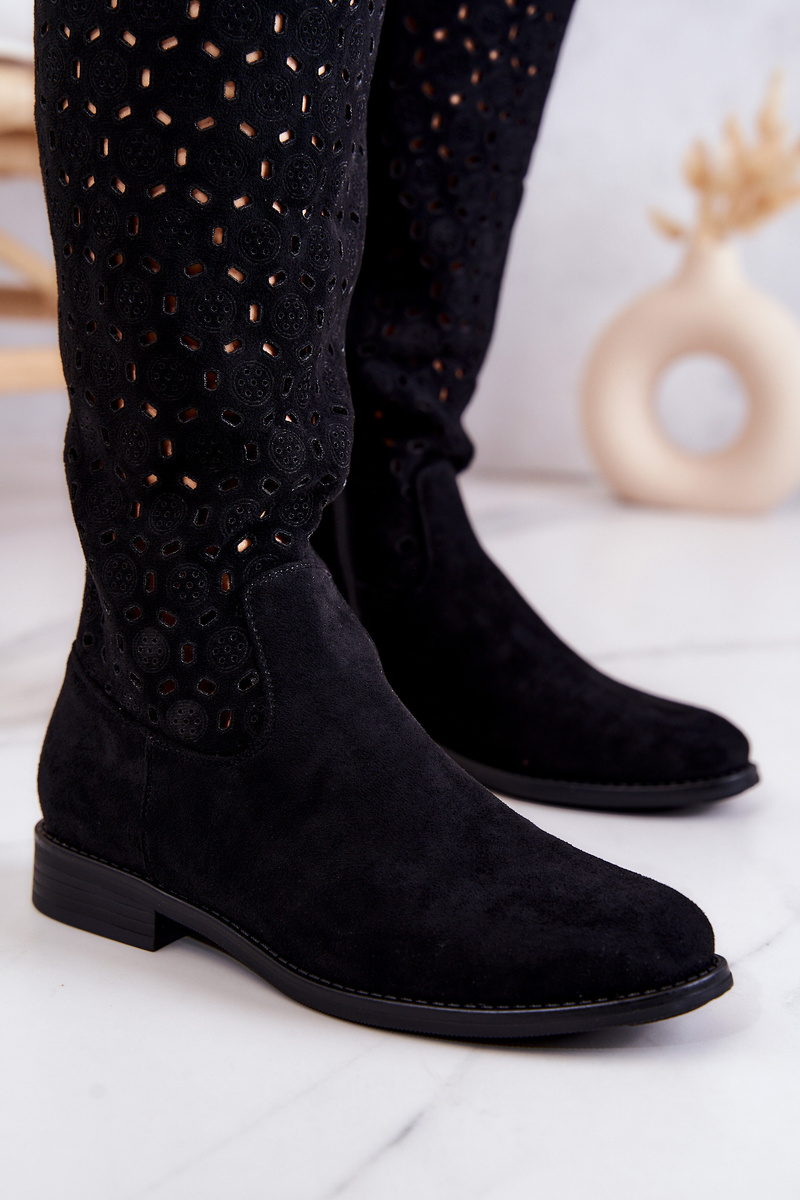 Pohodlné a stylové - tak se budete cítit v tomto modelu kozaček! Prolamovaný svršek z ekologického semiše. Obuv má kvalitní stélku z ekokůže, vyztuženou patu a zip, který usnadňuje obouvání. Nasazené na plochém podpatku. Povinná výbava každého fanouška prolamovaných bot! Při výběru velikosti použijte tabulku velikostí.
