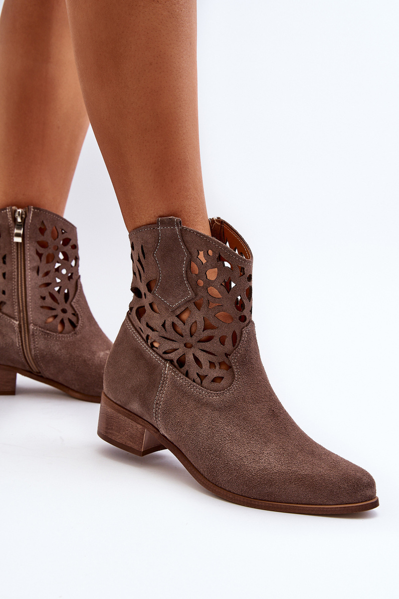 Dámské boty vyrobené z přírodního semiše. Umístěné na nízkém podpatku, což z nich činí stylové a pohodlné. Vzor na svršku dodává eleganci. Tento model je zapínán na zip, co usnadňuje obutí. Měkká stélka zaručuje pohodlí. Při výběru velikosti se řiďte tabulkou velikostí.