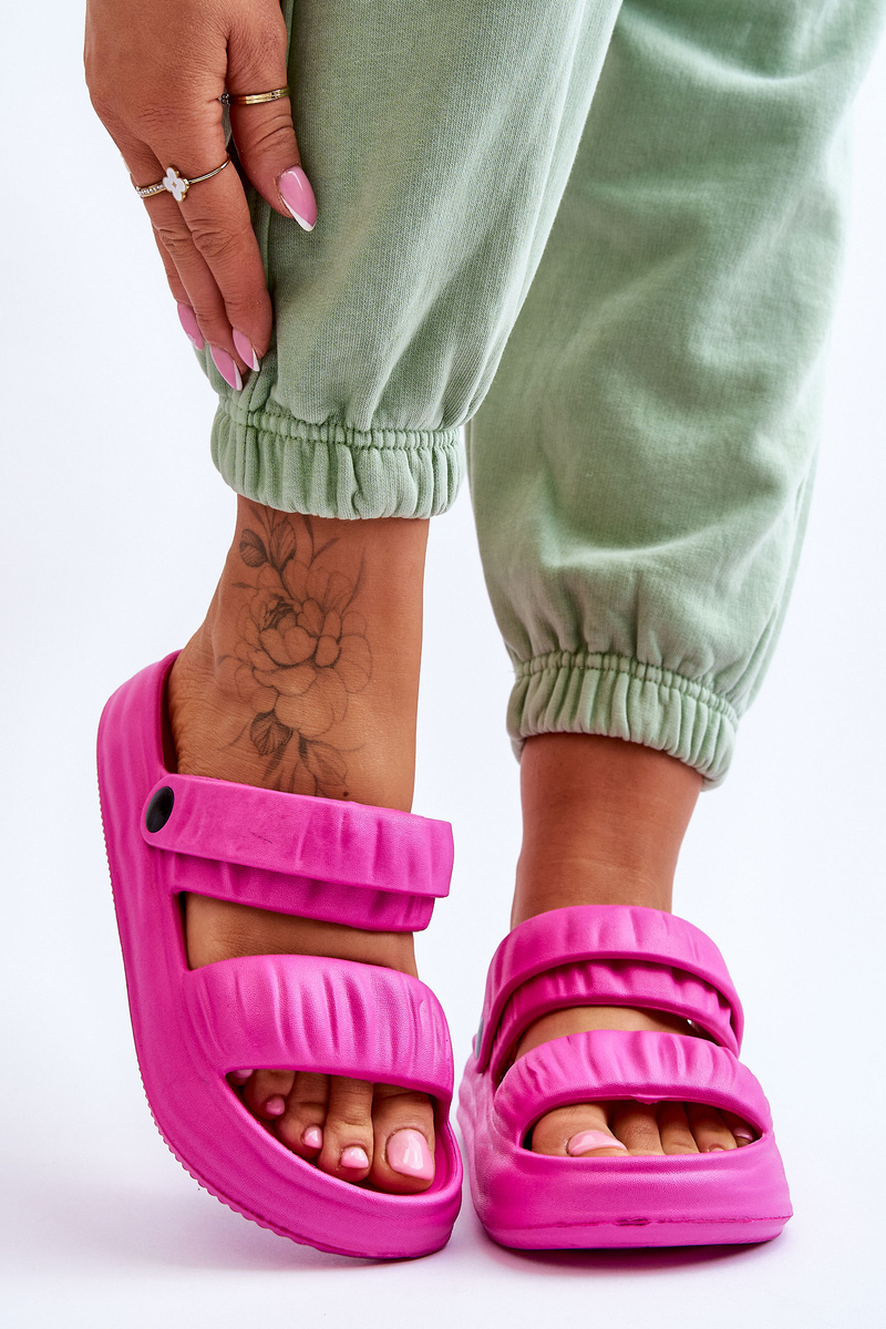 Lehké dámské pantofle, které rychle převléknete do sandálů! Stačí přetáhnout pásek přes zadní část chodidla. Žabky jsou vyrobeny z pěnového materiálu. Pruhy jsou tuhé a mírně vrásčité. Tento model je namontován na masivní platformě. Budou skvělé v horkých dnech! Při výběru velikosti se řiďte tabulkou velikostí.