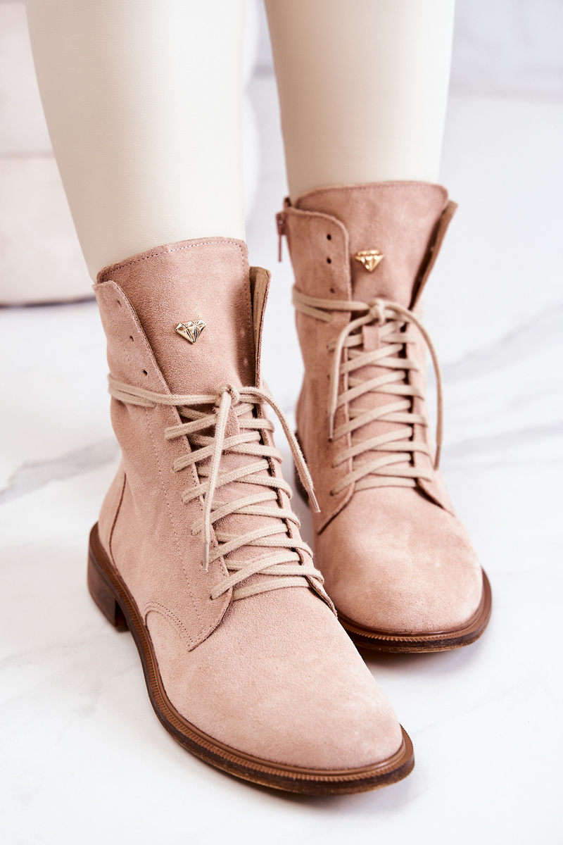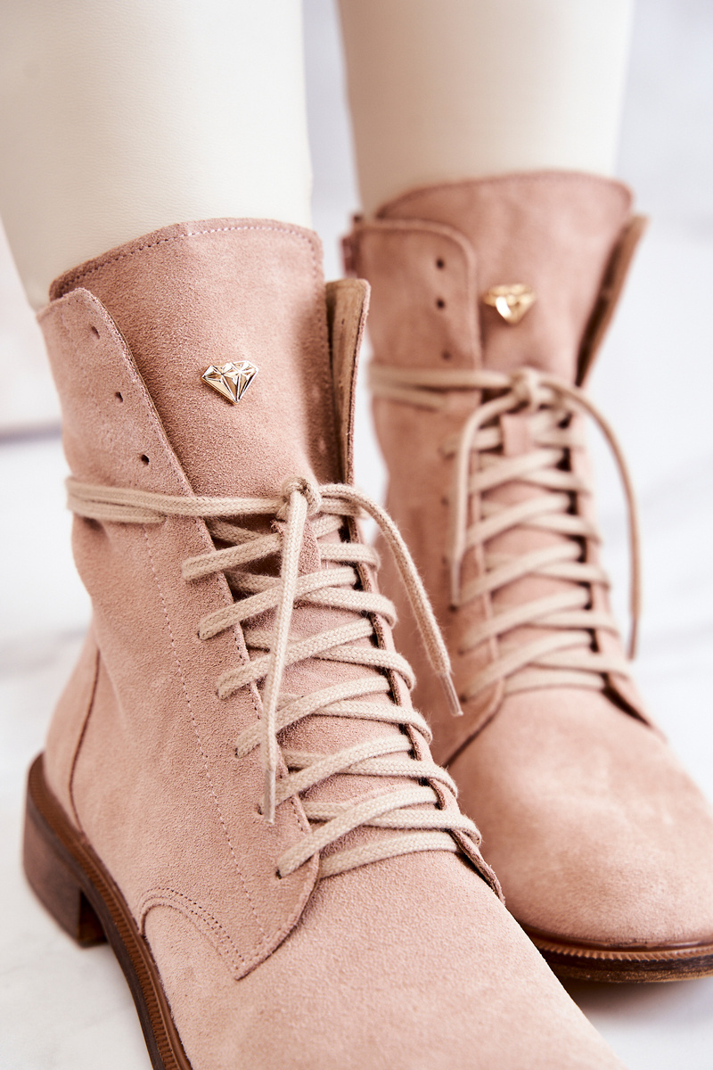 Boty jsou vyrobeny z přírodního semiše. Ozdoba na jazyku krásně podtrhuje jejich jedinečný styl. Snáze se bude nazouvat zip všitý na boku, přičemž tkaničky zajistí lepší padnutí. Kozačky založené na jemném plochém podpatku. Uvnitř je kožená stélka, která se postará o vaše pohodlí. Při výběru velikosti použijte tabulku velikostí.
