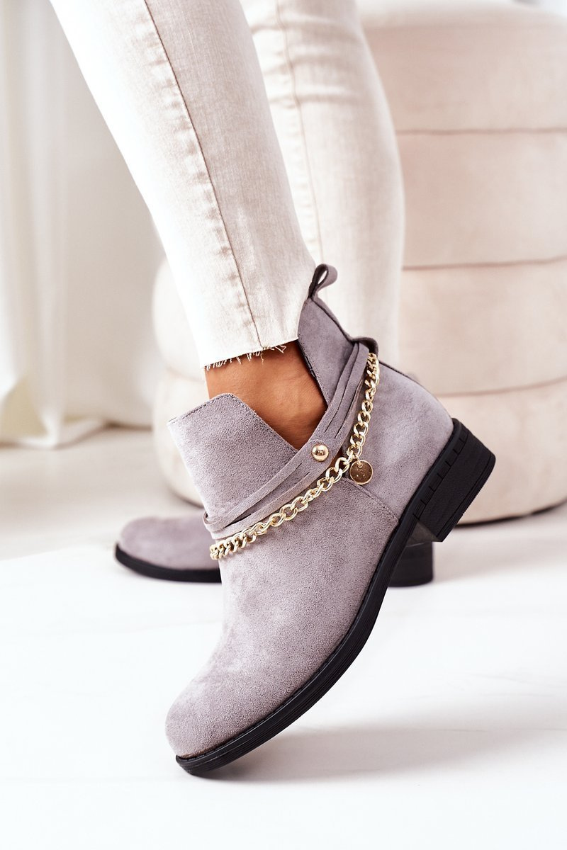 Dámské kozačky z eko semiše zdobené zlatým řetízkem. Při výběru velikosti použijte tabulku velikostí.