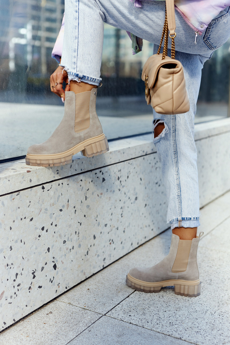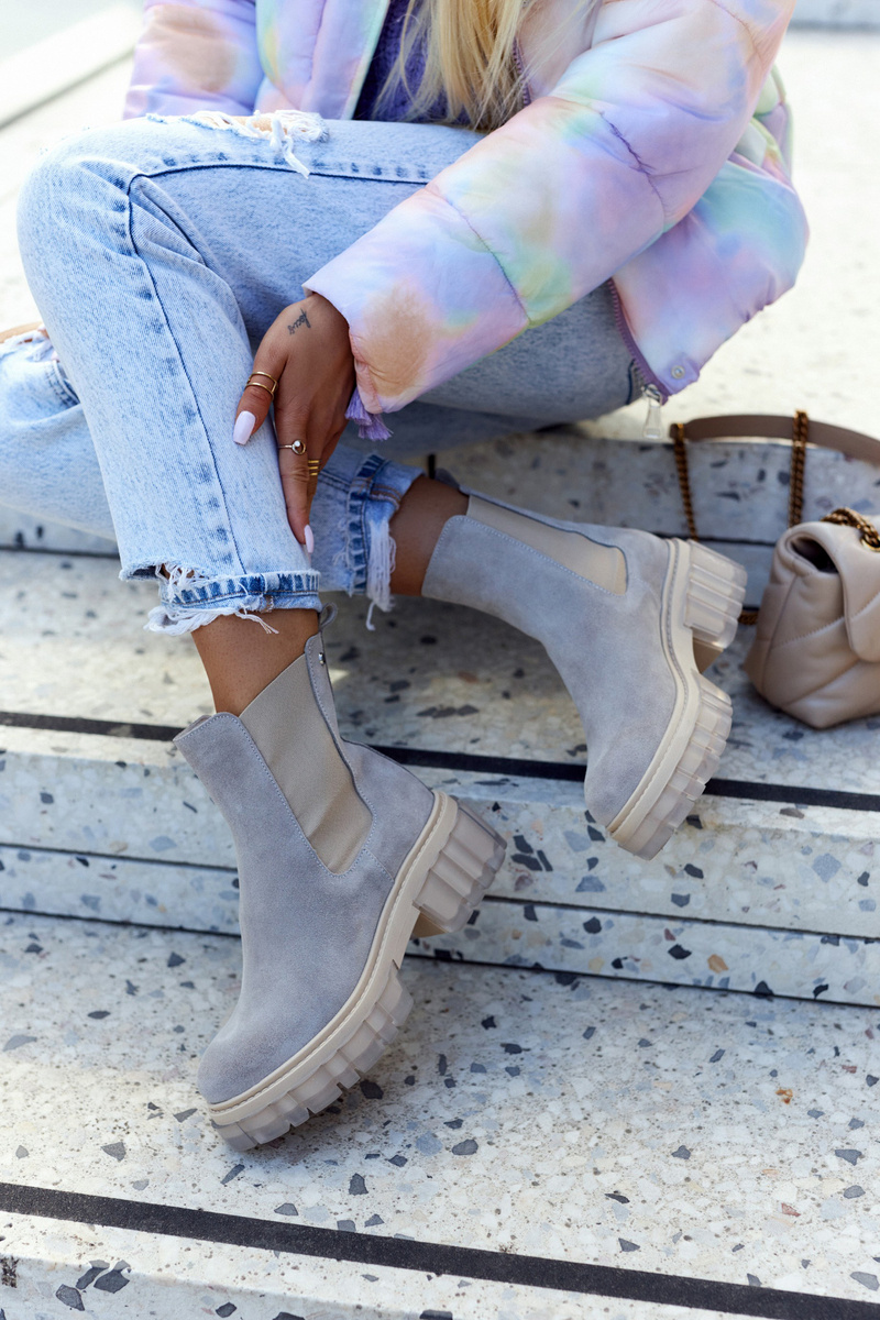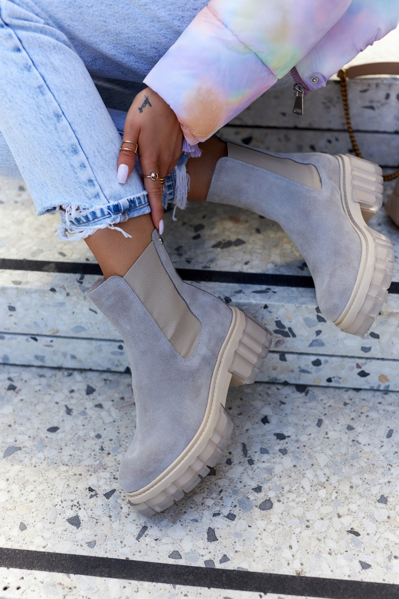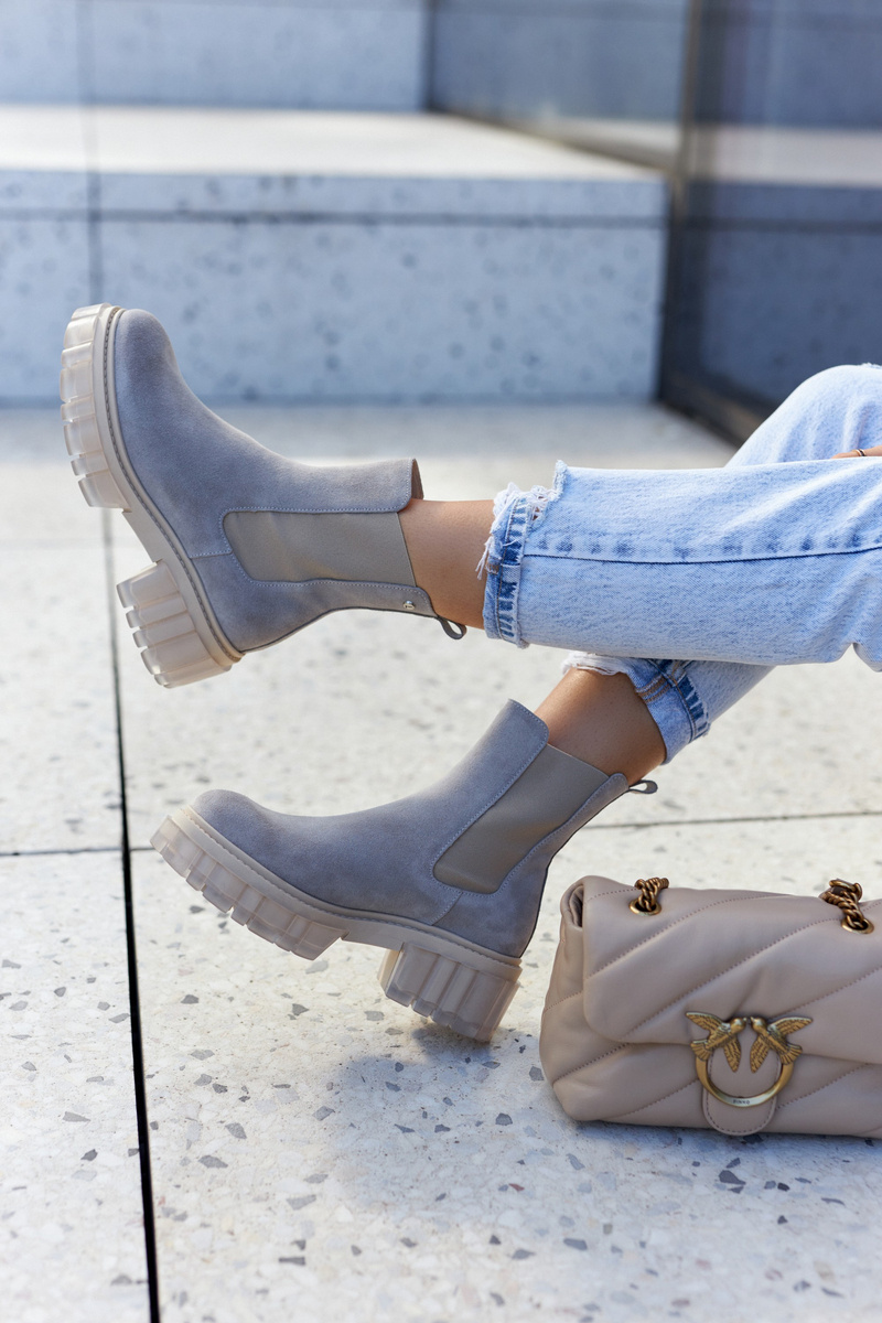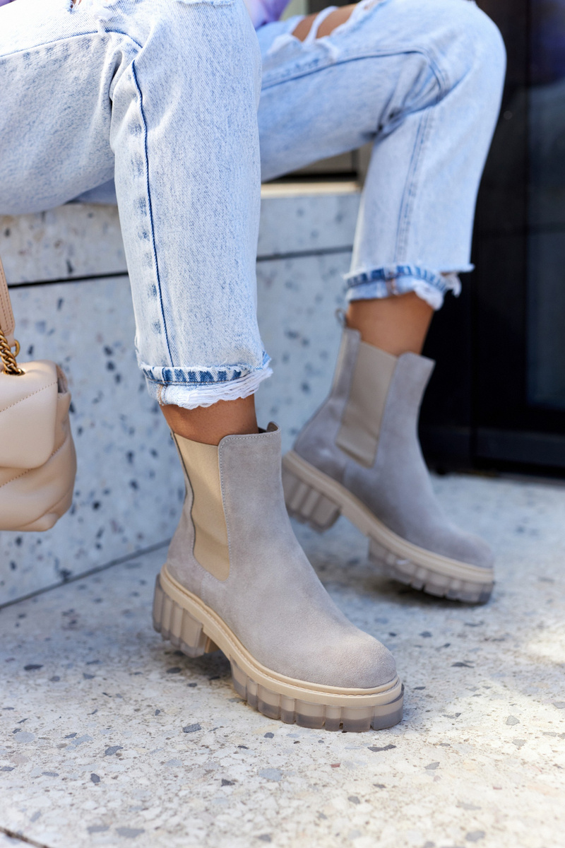 Kozačky na masivní platformě se širokým podpatkem ve stylu Chelsea boots. Mají vysoký svršek, sahající až nad kotník. Vyrobeno z přírodní semišové kůže. Mají dodatečnou pružnou vsadku, díky které se svršek dokonale přizpůsobí šířce nohavic. Boky podrážky zdobí průhledný, gumový materiál. Při výběru velikosti použijte tabulku velikostí