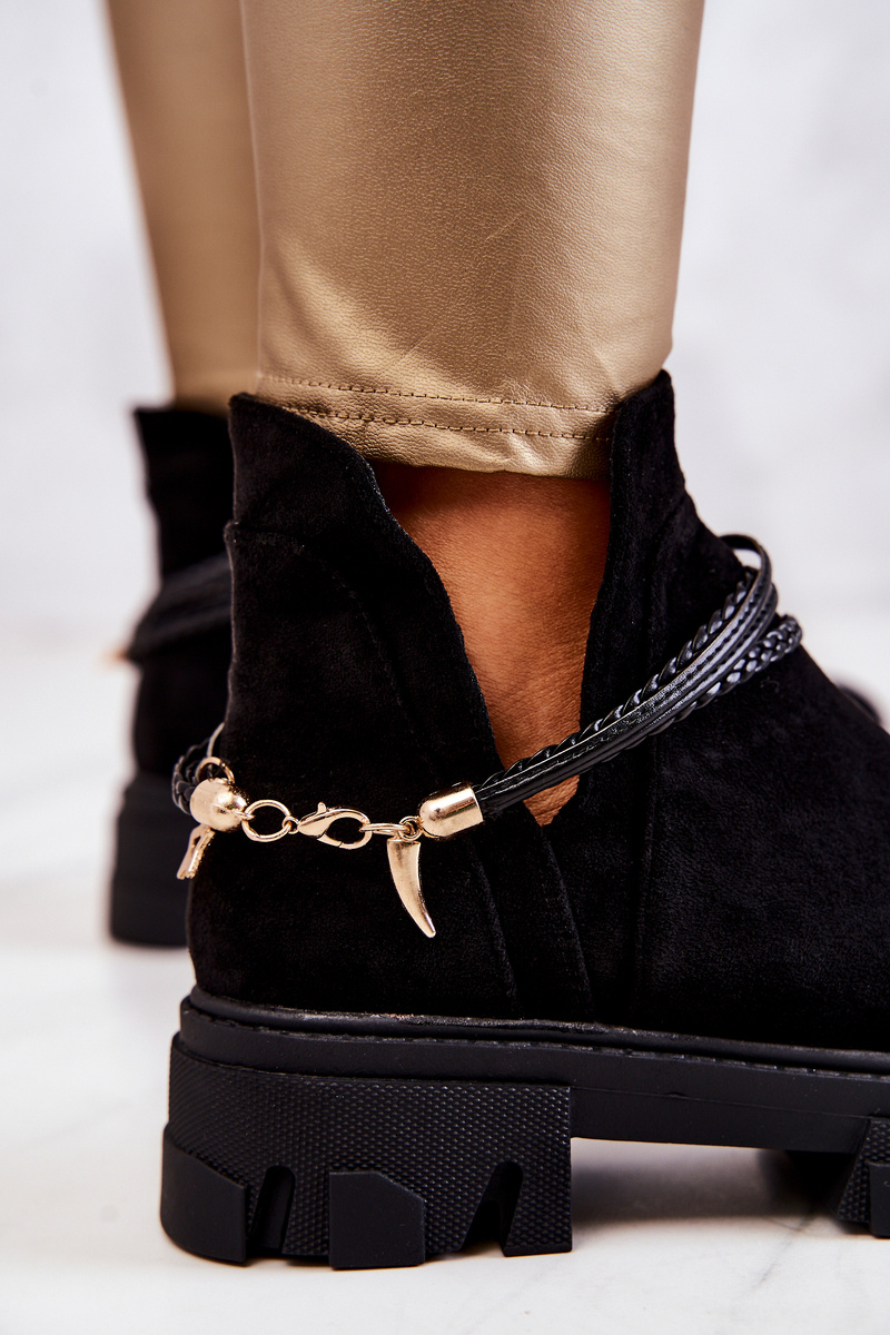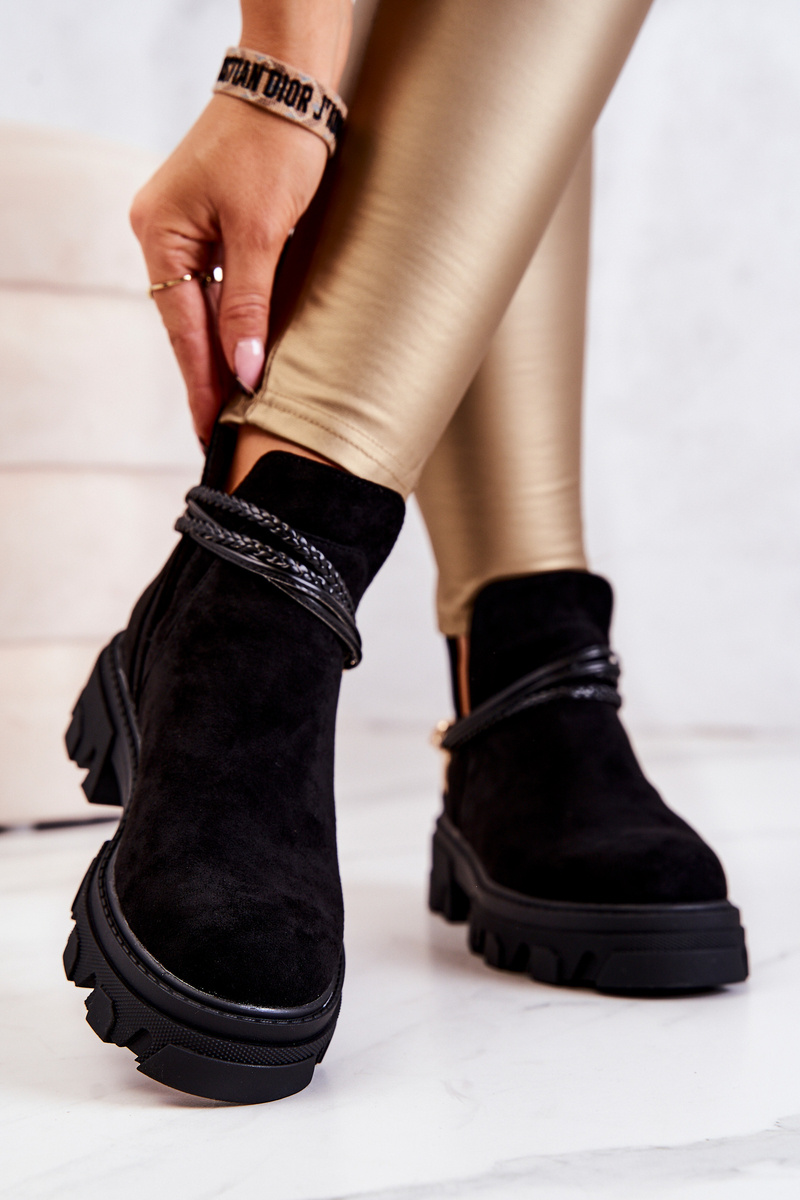 Kozačky s výřezy z ekologického semiše. Mají masivní podrážku, která chrání před chladnou zemí. Splétané ozdobné pásky mají dodatečný přívěsek v podobě hvězdy s kubickou zirkonií. Dají se oddělit. Díky kotníkovým výřezům vypadají tyto kotníkové boty velmi efektně. Při výběru velikosti použijte tabulku velikostí.