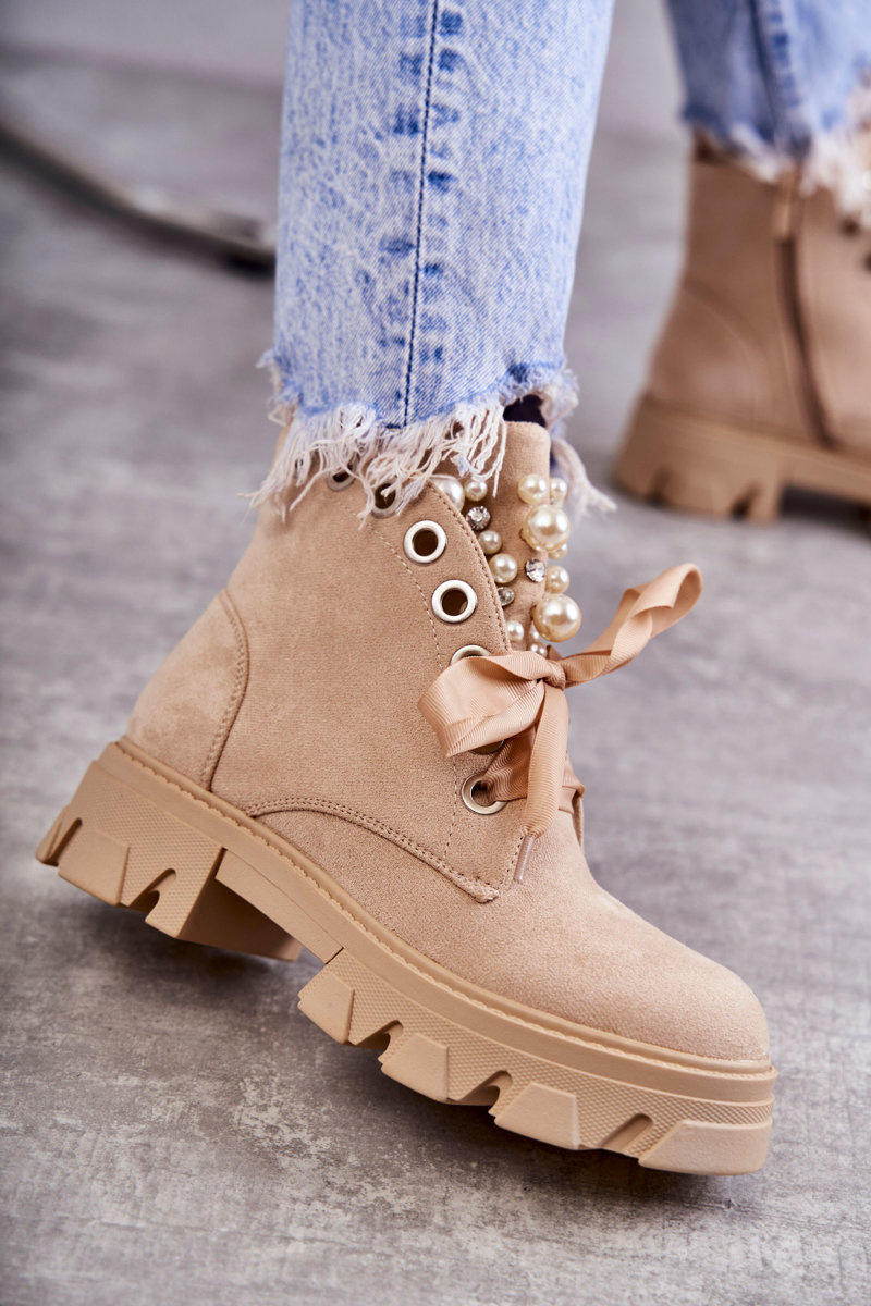 Jedinečné dámské kozačky vyrobené z ekologického semiše. Vnitřek je zateplen přikrývkou na obuv, která je příjemná na dotek. Model vyniká střihem svršku a prvky v podobě perliček a cvočků. Ozdobná stuha celek skvěle dotváří. Zapínání také na zip na boční straně svršku. Sada na platformě a plochých podpatcích. Tento model musí být váš! Už nečekejte, až zmizí! Při výběru velikosti použijte tabulku velikostí.