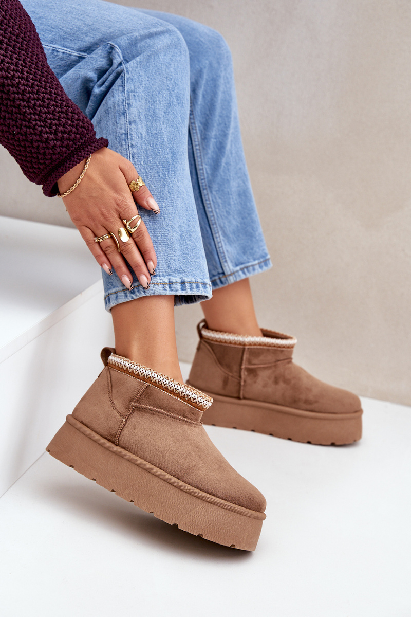 Stylové dámské sněhule vyrobené z eko semiše. Usazeny na platformě, která účinně izoluje od studeného povrchu. Vnitřek bot je zateplen měkkým kožíškem, který zajišťuje teplo a pohodlí v mrazivých dnech. Horní část svršku zdobí jemná výšivka, která dodává výjimečný půvab. Ideální volba na zimní procházky a každodenní aktivity v chladných dnech! Při výběru velikosti se řiďte tabulkou velikostí.