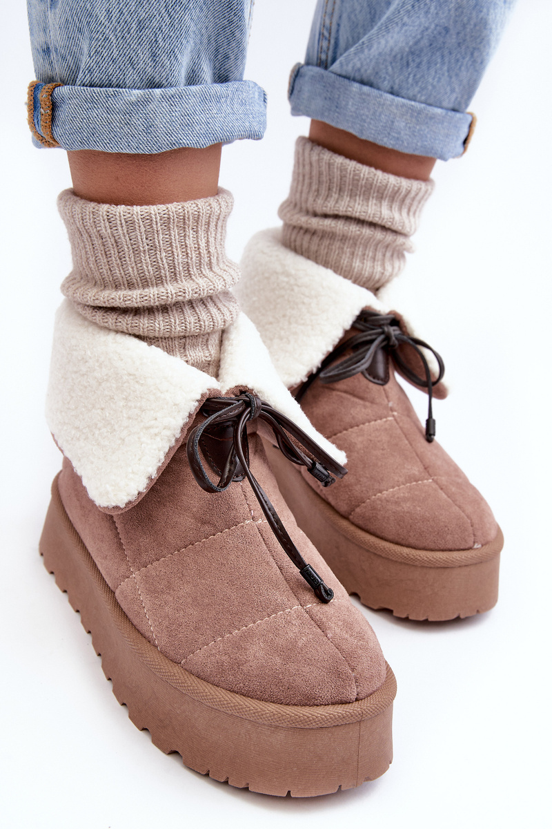 Dámské sněžné boty se skvěle osvědčí během mrazivých dnů. Vyrobeno z eko semiše. Upevněno na silné platformě. Zateplené kožešinou. Slip-on styl. Horní část je ozdobena tkanicí. Při výběru velikosti se řiďte tabulkou velikostí.