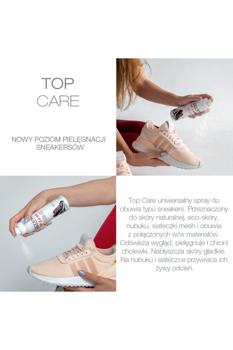Top Care univerzální sprej na obuv typu sneakers. Určený pro přírodní kůži, eco-kůži, nubuk, síťovinu a obuv z kombinovaných výše uvedených materiálů. Osvěžuje vzhled, pečuje a chrání svršky. Leskne hladké kůže. Na nubuku a síťovině vrací jejich živou barvu.