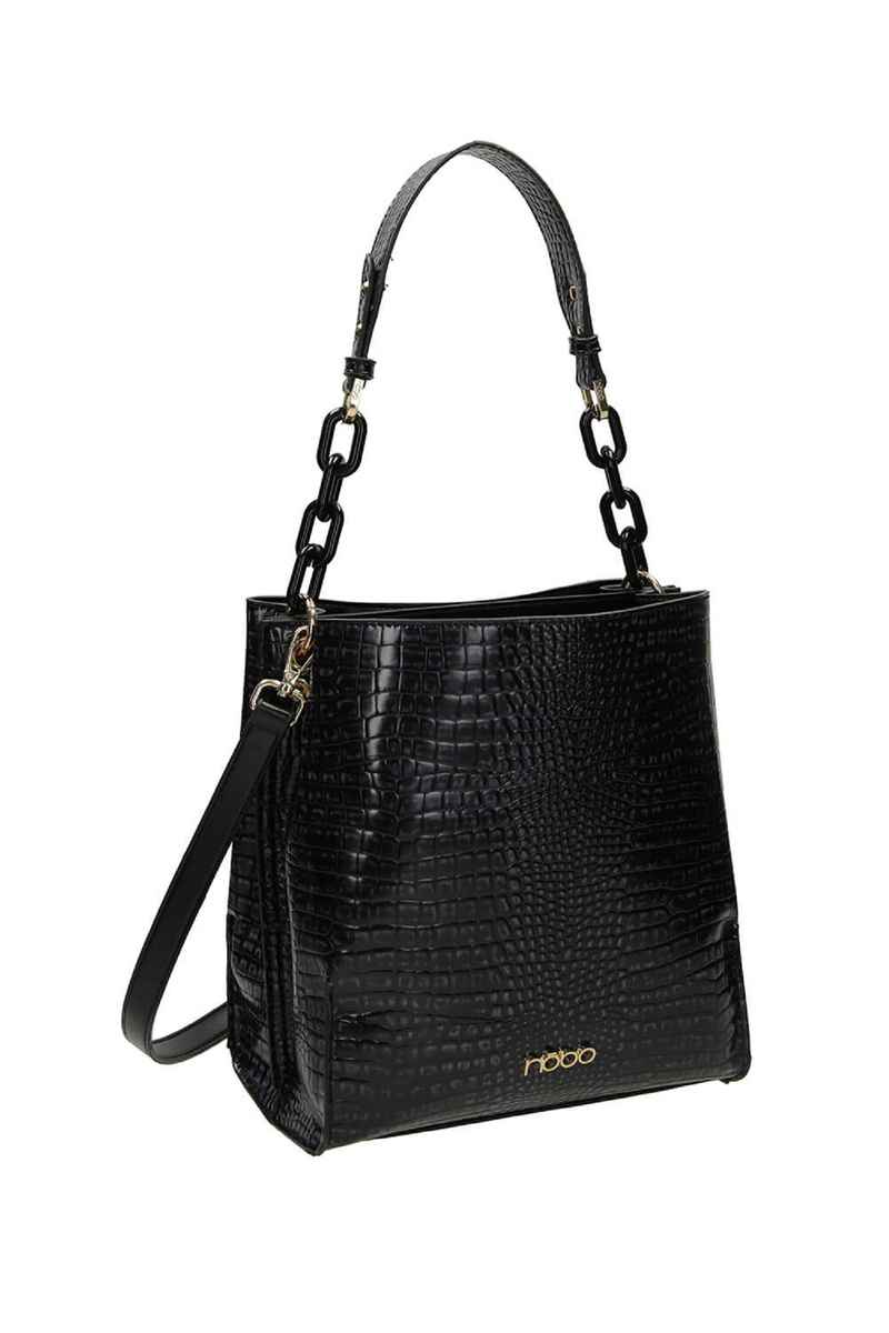 Taška přes rameno Nobo má dvě samostatné přihrádky zapínané na magnet. Vyrobeno z eko kůže se vzorem připomínajícím hadí kůži. Tašku lze nosit na silném opasku s řetízkem nebo připojením přídavného, nastavitelného popruhu. U tohoto modelu je na zadní straně kapsa na zip, do které schováte například telefon.