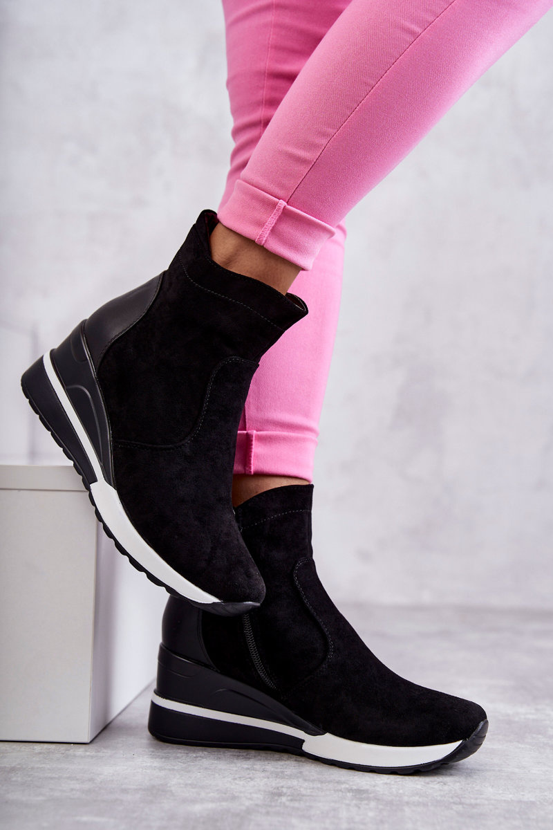 Elegantní tenisky na klínku z ekologické kůže. Díky klínku jsou velmi pohodlné na nošení a zároveň vypadají skvěle. Zapínání na zip na boku boty. Vyztužená pata. Uvnitř je izolace v podobě deky na boty. Tenisky na klínku jsou skvělou volbou pro mnoho stylů. Musíte je mít! Při výběru velikosti použijte tabulku velikostí.