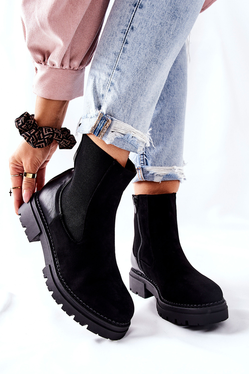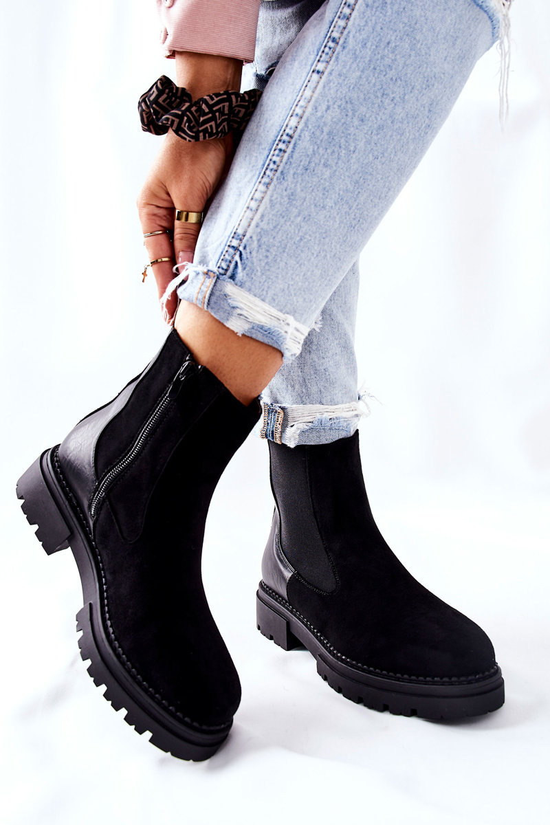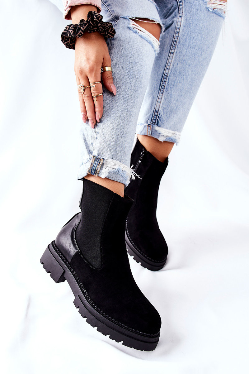 Dámské boty z ekologického semiše. Vnitřní strana je zateplená na dotek příjemnou přikrývkou na boty. Mají zip a elastický svršek. Stabilní plochý podpatek zajišťuje pohodlí za různých povětrnostních podmínek. Při výběru velikosti se řiďte tabulkou velikostí.