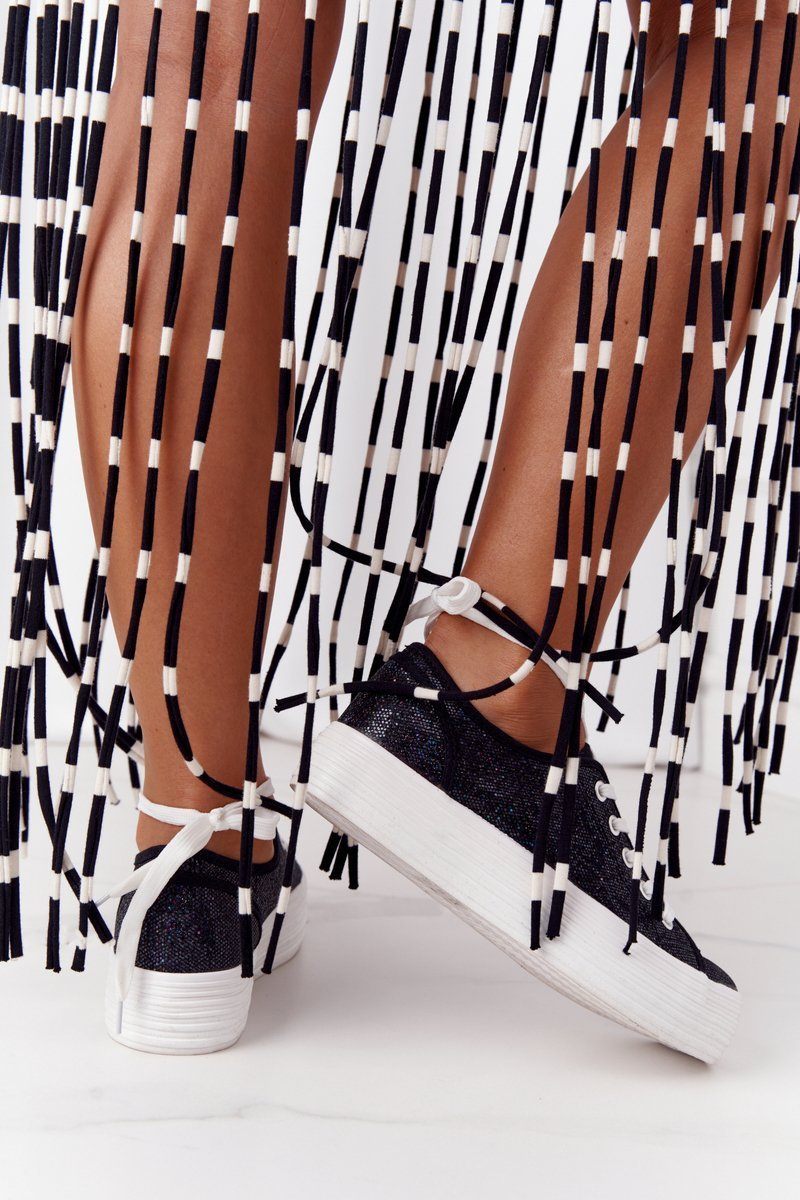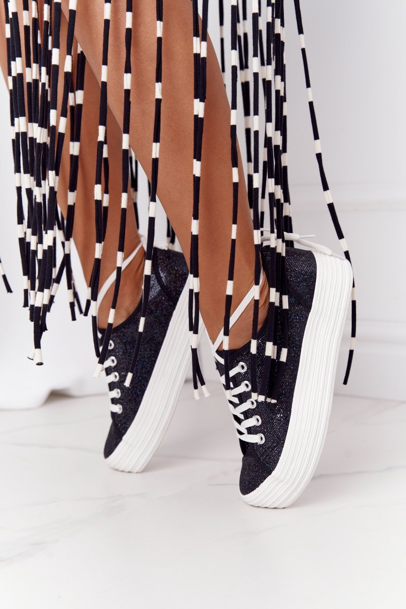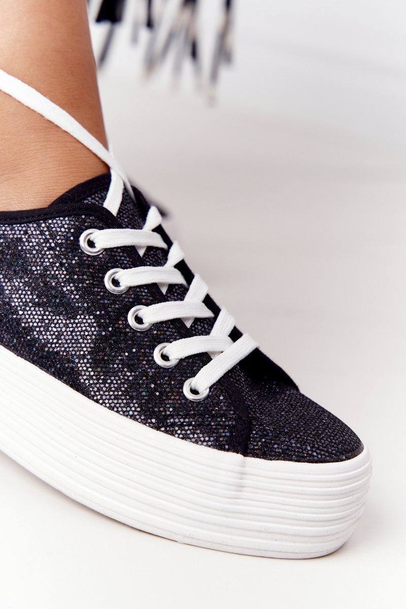 Dámské tenisky na platformě zdobené barevnými třpytkami. Tenisky mají měkkou materiálovou stélku a protiskluzovou podrážku. Při výběru velikosti použijte tabulku velikostí.