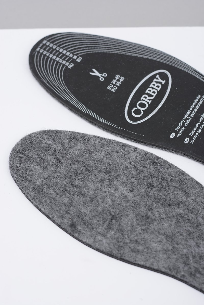 Dwuwarstwowe wkładki ocieplające wykonane z wysokogatunkowej włókniny oraz pianki lateksowej z dodatkiem węgla aktywnego, który doskonale pochłania wszelkie nieprzyjemne zapachy. Wyściółka z filcu, dzięki swoim właściwościom termoizolacyjnym, chroni przed wilgocią, zapewnia stopom właściwą temperaturę, miękkość oraz wygodę, zaś warstwa elastycznego lateksu równoważy naciski na podeszwę amortyzując jednocześnie mikrowstrząsy powstające w trakcie chodzenia.