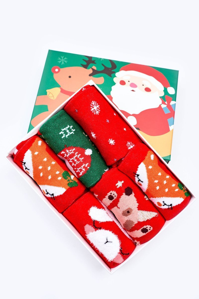 Sada 6 párů dětských vánočních ponožek. Sada obsahuje 1 zelený pár a 5 červených. Ponožky přicházejí v různých konfiguracích.