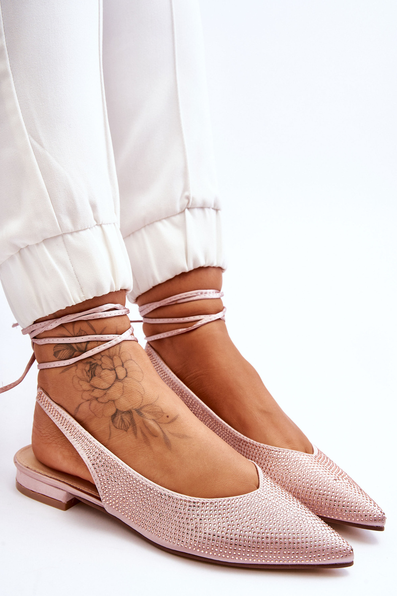 Módní baleríny s otevřenou patou a špičatou špičkou jsou vyrobeny z textilního materiálu. Svršek byl navíc zdoben tryskami. Měkká stélka z ekokůže zajistí pohodlí při používání. Balerínky mají plochý podpatek a zavazování kolem lýtka. Skvělý model pro teplejší dny! Při výběru velikosti se řiďte tabulkou velikostí.