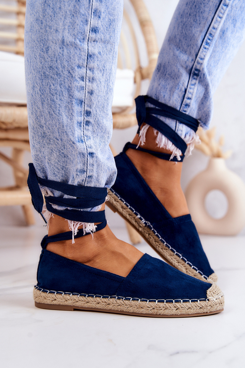 Klasické espadrilky na ploché podrážce. Stélka je vyrobena z eko kůže. Zajímavý model, který byste neměli mít ve svém šatníku! Eko semišové espadrilky se zavazují kolem nohy. Látkový pásek je vytažen. Protiskluzová a pletená podrážka. Určitě se také podívejte na naši další kolekci dámských espadrilek.