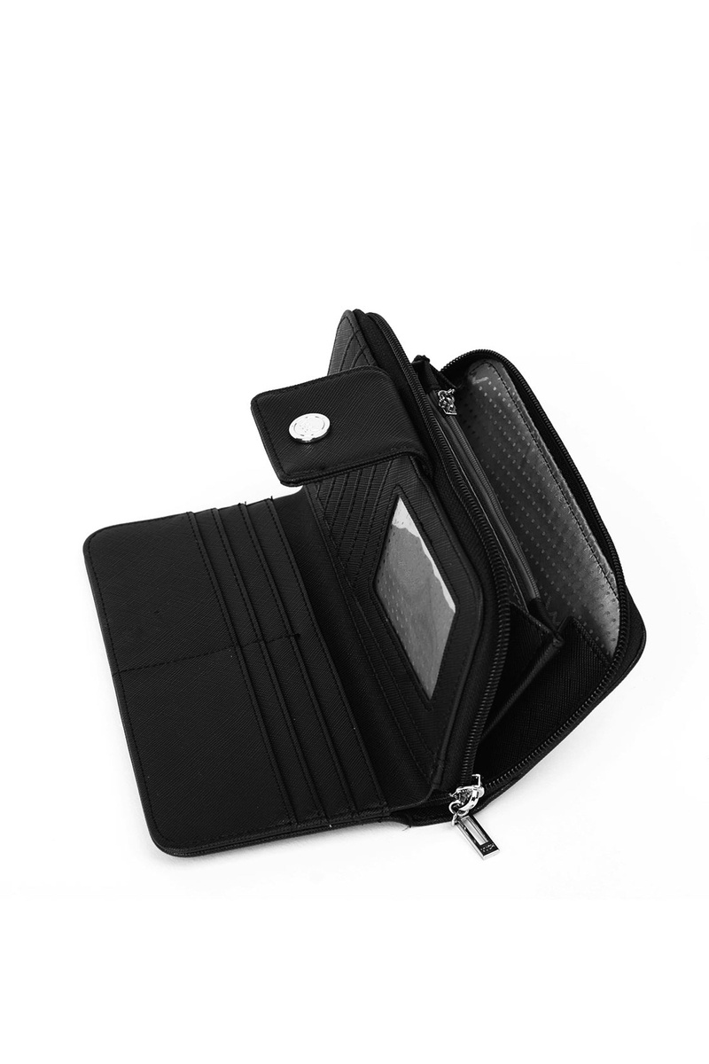 Vynikající peněženka se zipem a zapínáním. Má několik menších otevřených kapes, mimo jiné na doklady nebo vizitky. Přihrádka na zip je rozdělena na dvě menší, do kterých můžete vkládat poznámky. K dispozici je také kapsa na zip na mince. Peněženka je vyrobena z ekologické kůže a na přední straně má logo a emblém.