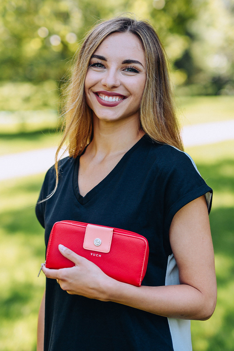 Vynikající peněženka se zipem a zapínáním. Má několik menších otevřených kapes, mimo jiné na doklady nebo vizitky. Přihrádka na zip je rozdělena na dvě menší, do kterých můžete vkládat poznámky. K dispozici je také kapsa na zip na mince. Peněženka je vyrobena z ekologické kůže a na přední straně má logo a emblém.
