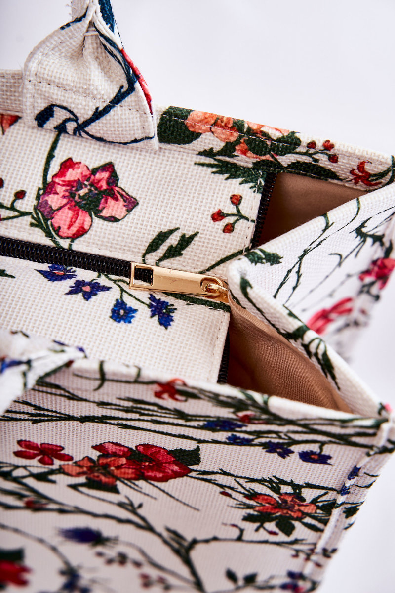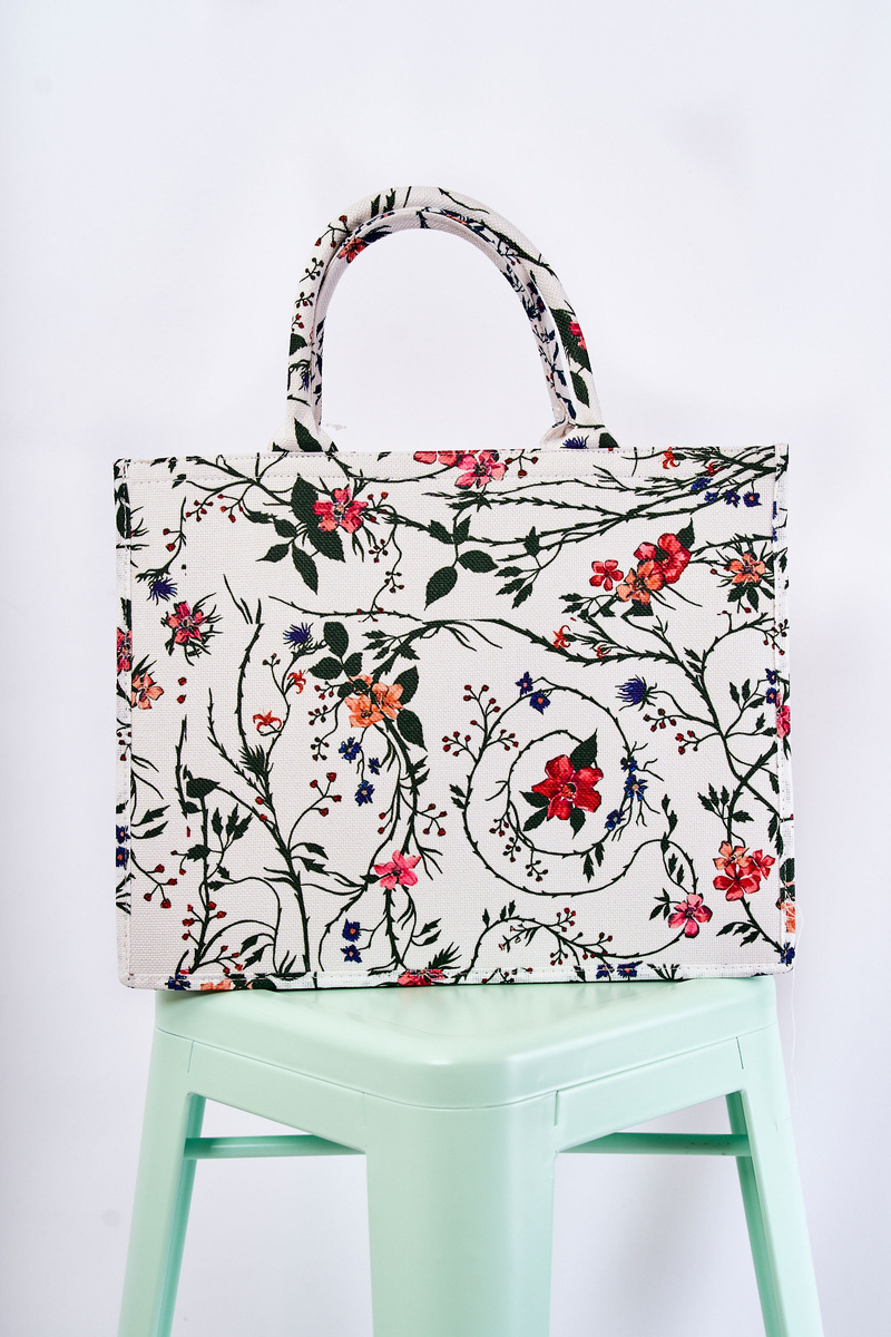 Pevná, velká kabelka s krásným vzorem. Taška bude skvělým doplňkem jarních a letních stylizací. Vyrobeno z textilního materiálu. Složení: 50% polyester, 50% bavlna. Přihrádka se uzavírá zipem. Taška je navíc dodávána s odnímatelným nastavitelným popruhem. Uprostřed jsou dvě menší, otevřené kapsy a jedna větší s gumičkou. Taška má uvnitř také vyztužené dno.