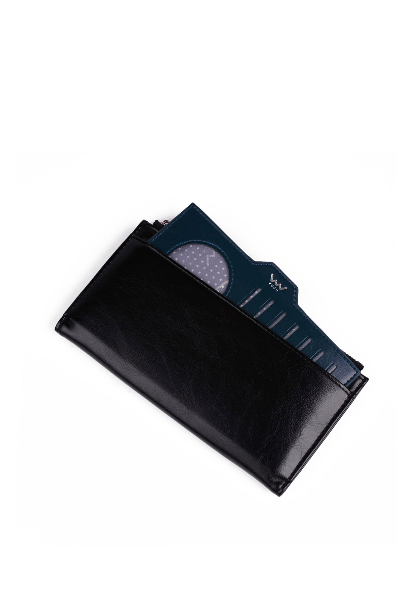 Tato peněženka potěší nejednoho milovníka jedinečných módních doplňků! Elegantní peněženka je vyrobena z ekologické kůže. Na přední straně je emblém s ozdobným zirkonem. Na zadní straně je otevřená kapsa s místem na fotografii v jiné barvě, než je barva peněženky. Zapínaná část obsahuje také místo na vizitky nebo průkaz totožnosti a fotografii. Do kapsy na zip se vejdou mince.