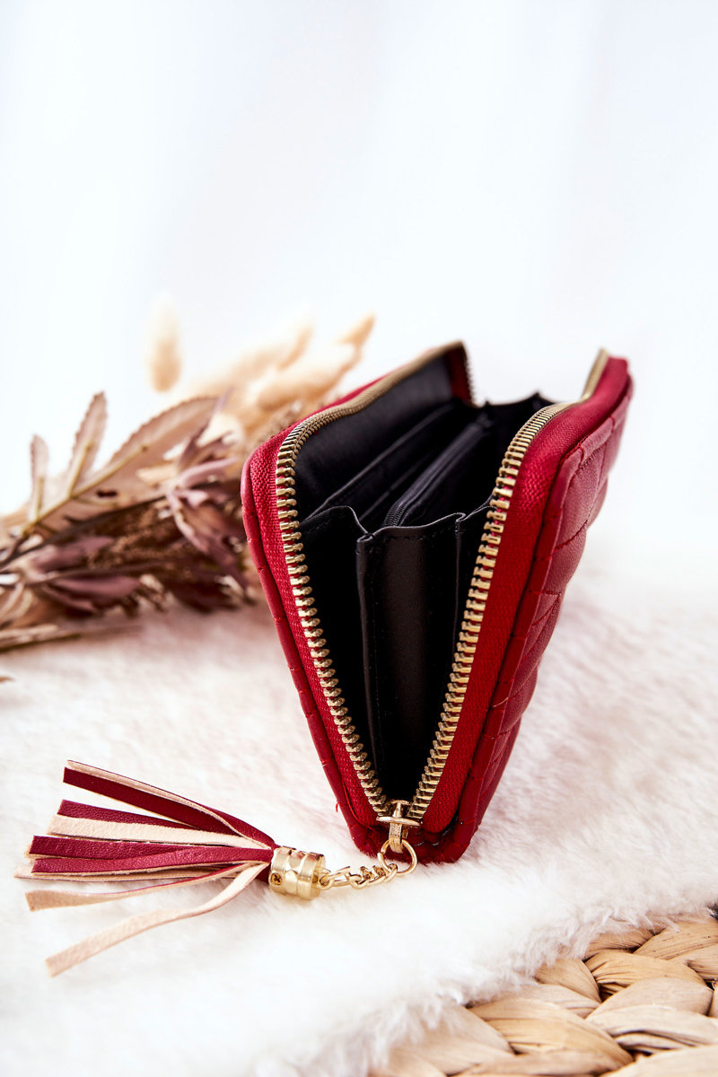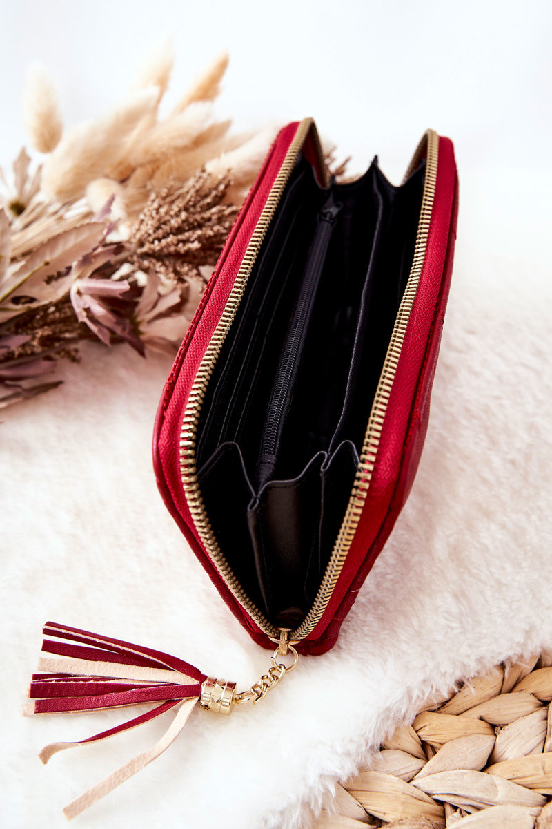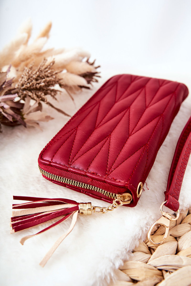 Velká a praktická peněženka se zapíná zvenčí na dva zipy. V jedné z přihrádek najdete místo na mince, bankovky a vizitky, zatímco do druhé se vejde malý smartphone, poznámky nebo dokumenty. Zvenku je peněženka vyrobena z prošívané ekokůže a na zipech jsou střapce. Součástí balení je navíc opasek.