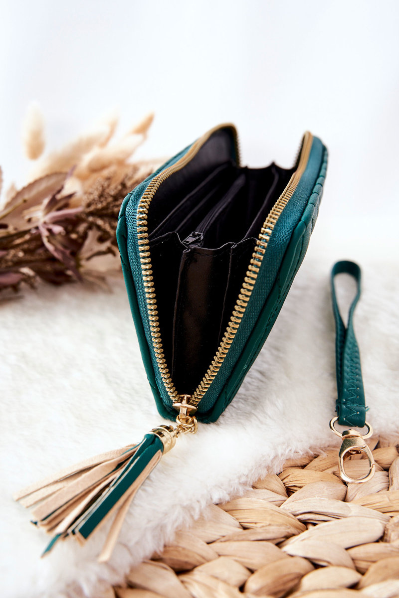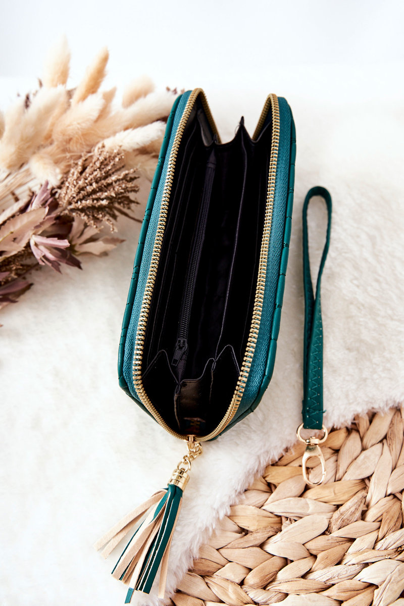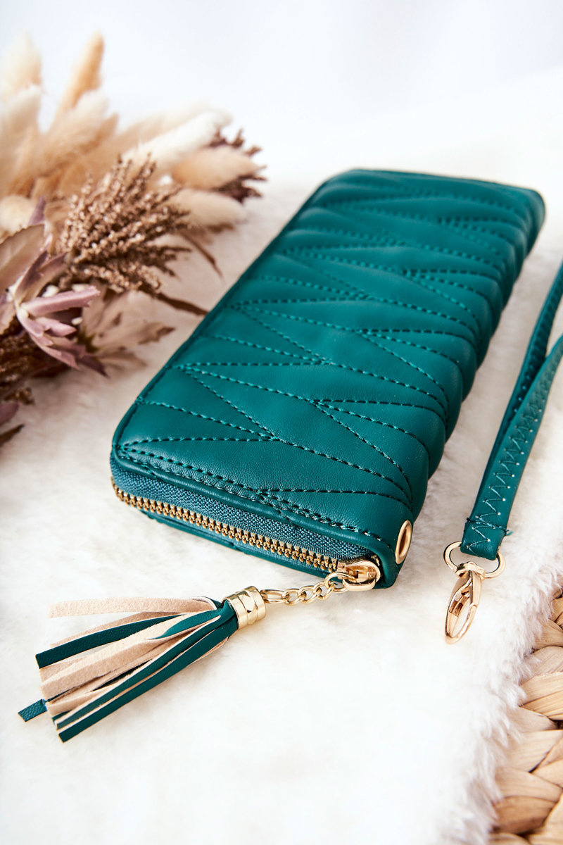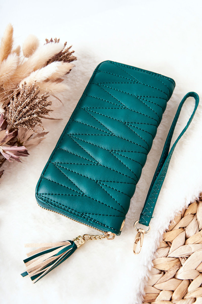 Velká prošívaná peněženka na zip s popruhem Zelený