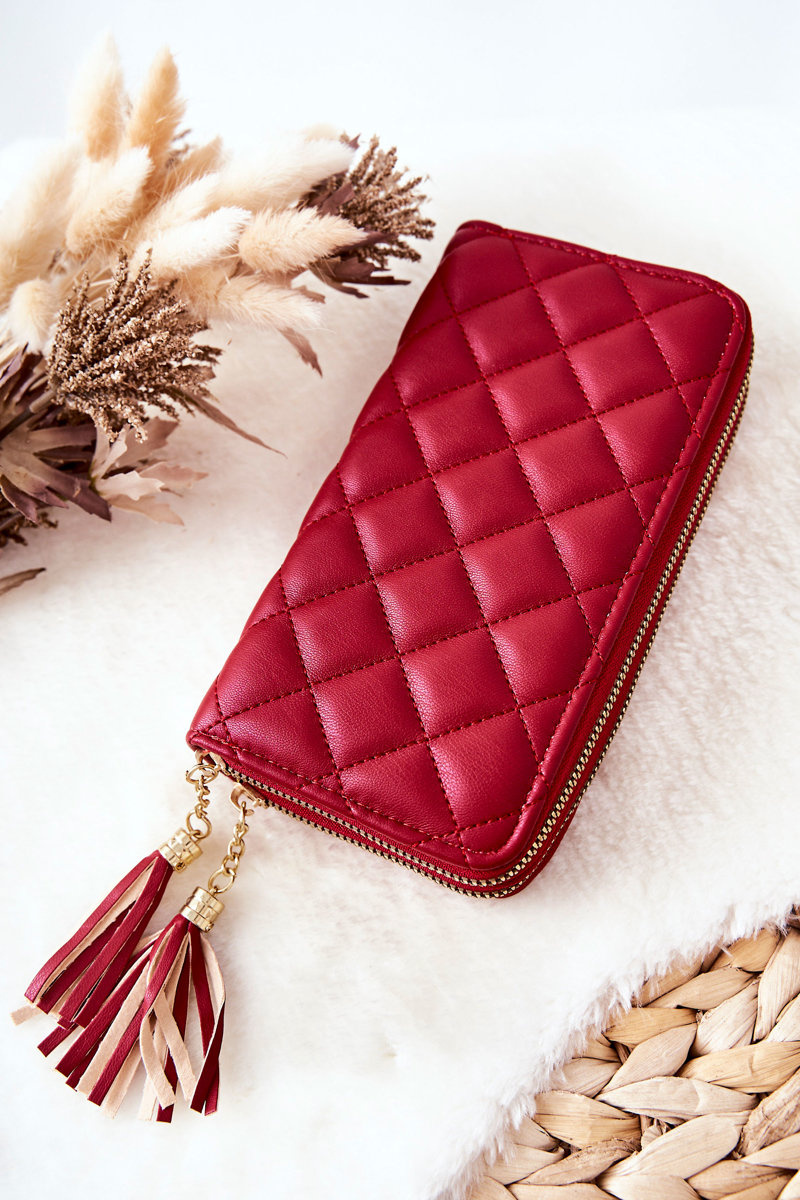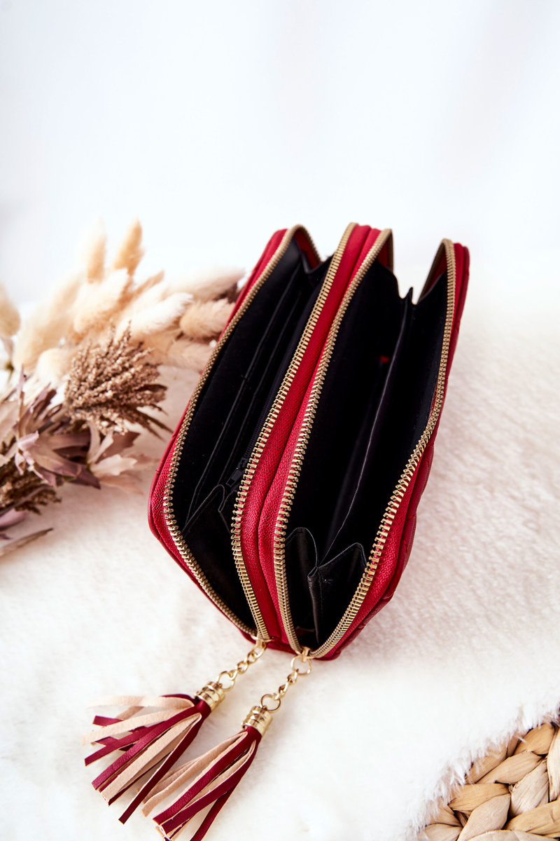 Velká a praktická peněženka se zapíná zvenčí na dva zipy. V jedné z přihrádek najdete místo na mince, bankovky a vizitky, zatímco do druhé se vejde malý smartphone, poznámky nebo dokumenty. Zvenku je peněženka vyrobena z prošívané ekokůže a na zipech jsou střapce. Součástí balení je navíc opasek.