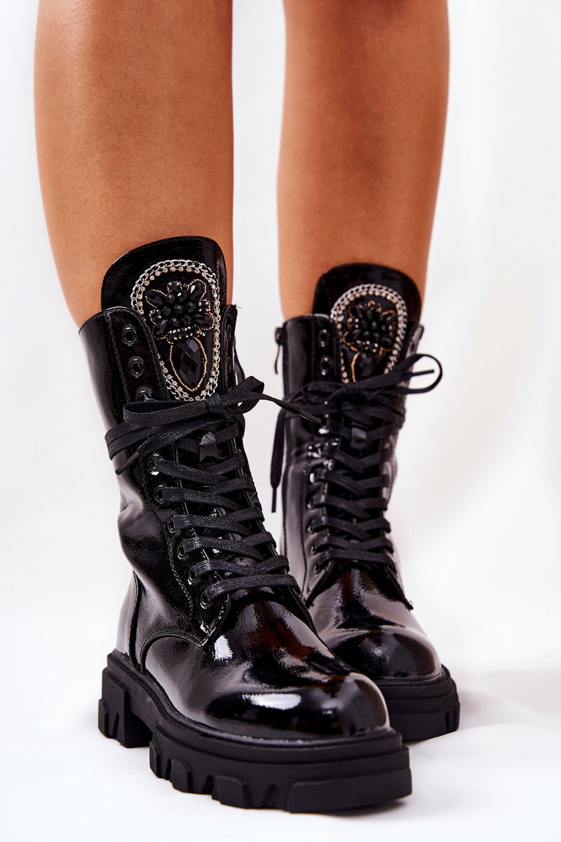 Skvělé vysoké boty mají na jazyku ozdobu z korálků, zirkonů a řetízků. Vyrobeno z lakované ekokůže. Jsou vybaveny vázáním a zipem pro snadné obouvání. Masivní podrážka Trapper zajišťuje stabilitu na každém kroku. Hřejivé v podobě jemné kožešiny uvnitř. Při výběru velikosti se prosím řiďte tabulkou velikostí