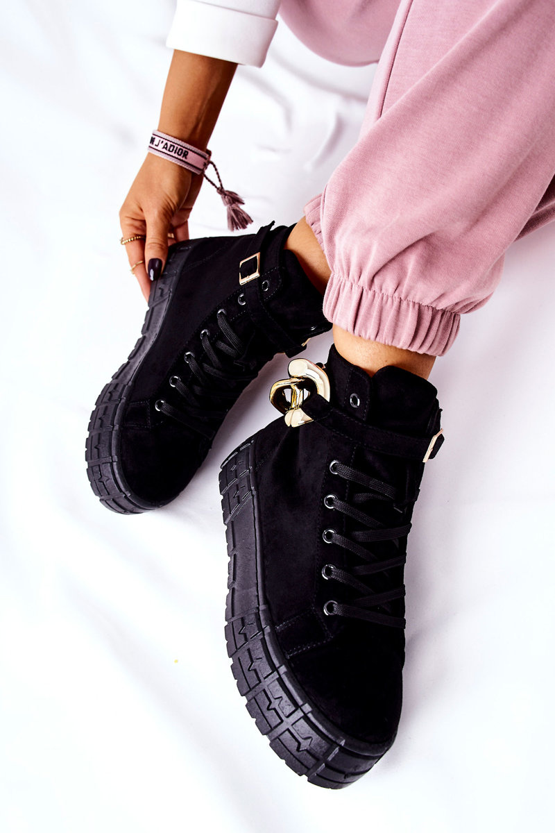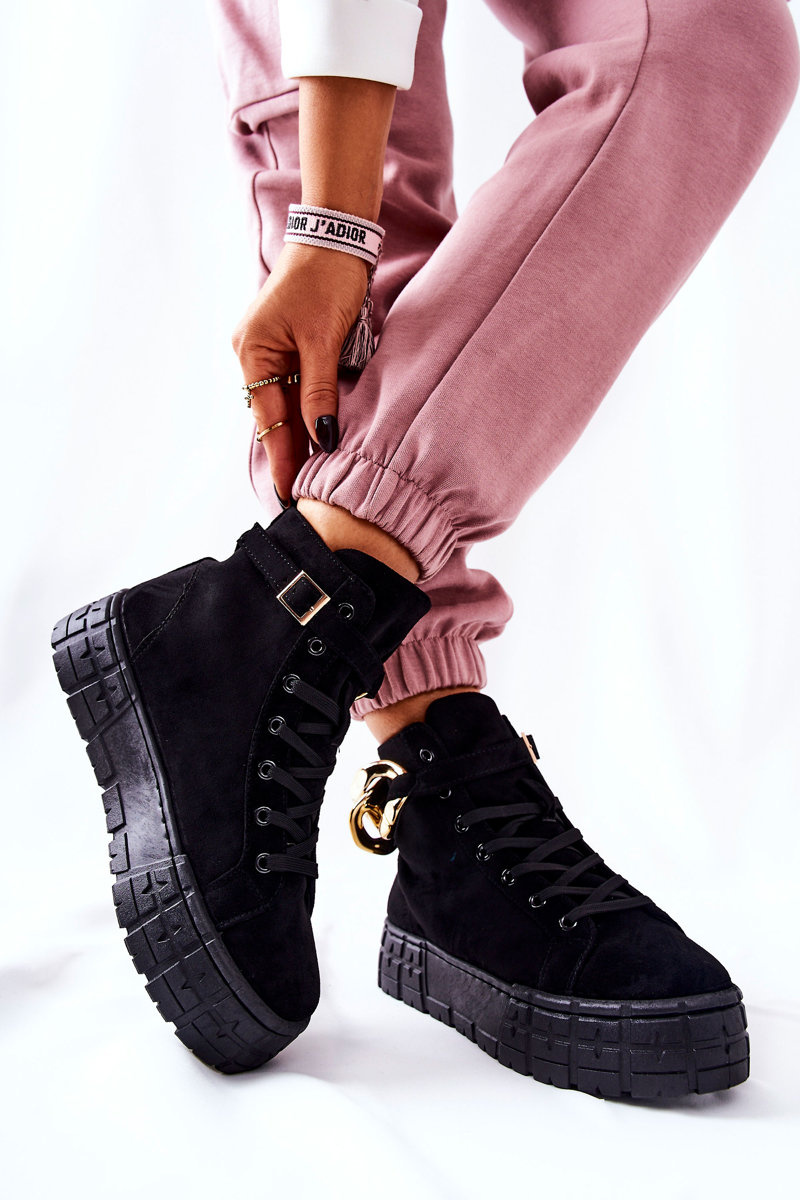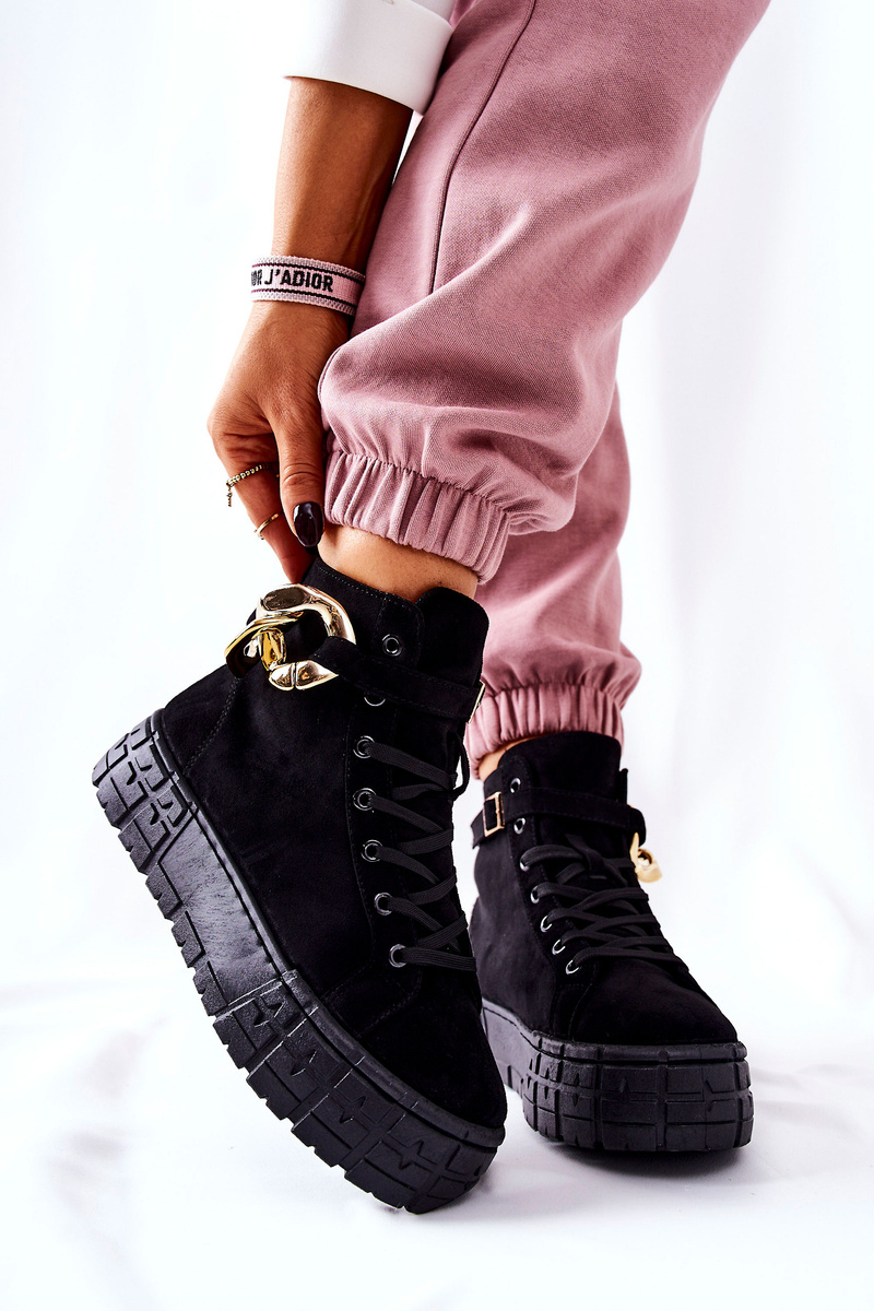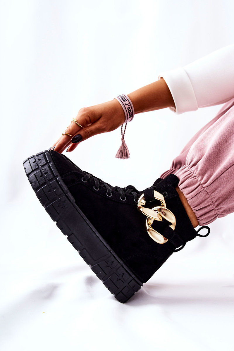 Boty byly vyrobeny ze semišové ekokůže. Vysoké tenisky mají na pásku ozdobný řetízek, který se zapíná na přezku. Lze ji také zcela odstranit. Boty mají vysokou a stabilní platformu. Vnitřní strana má látkovou stélku. Nezapomeňte se podívat na naši další nabídku platformových trenažérů! Při výběru velikosti se prosím řiďte tabulkou velikostí