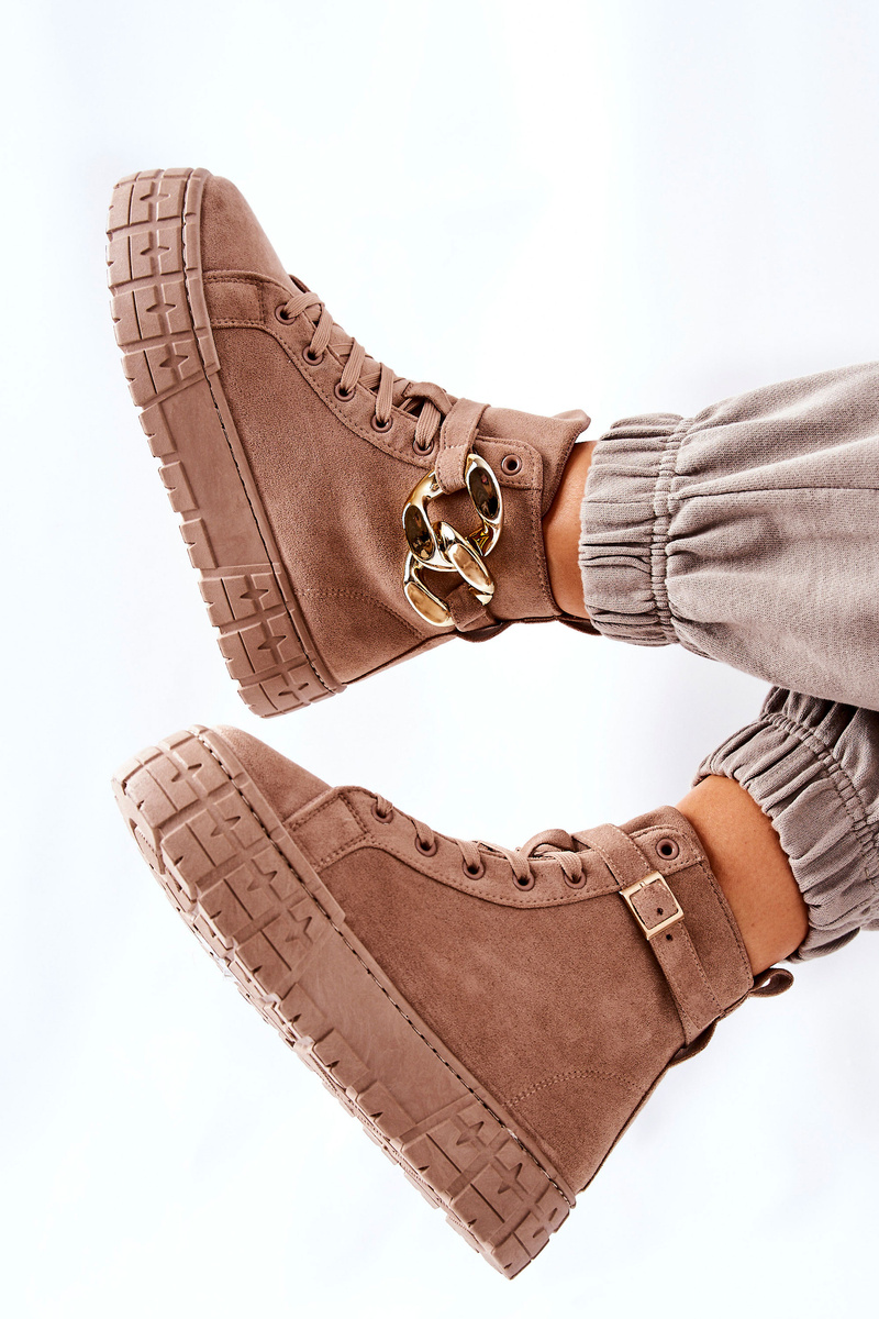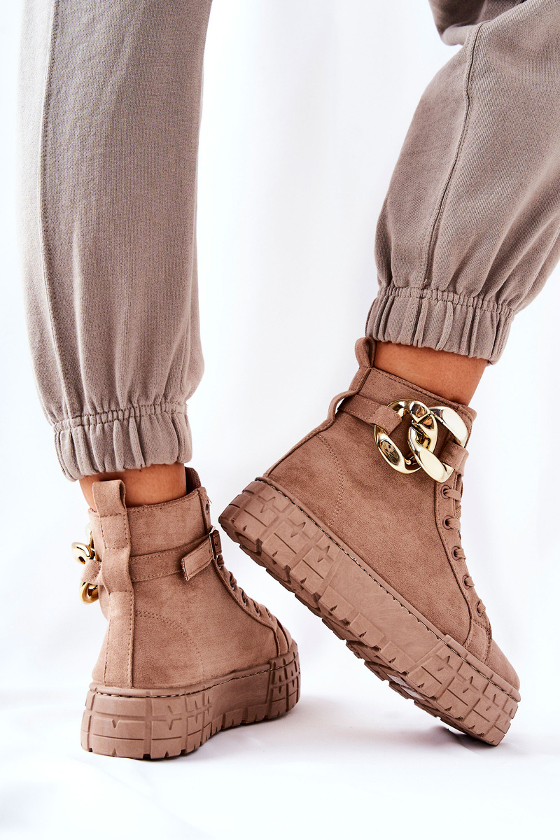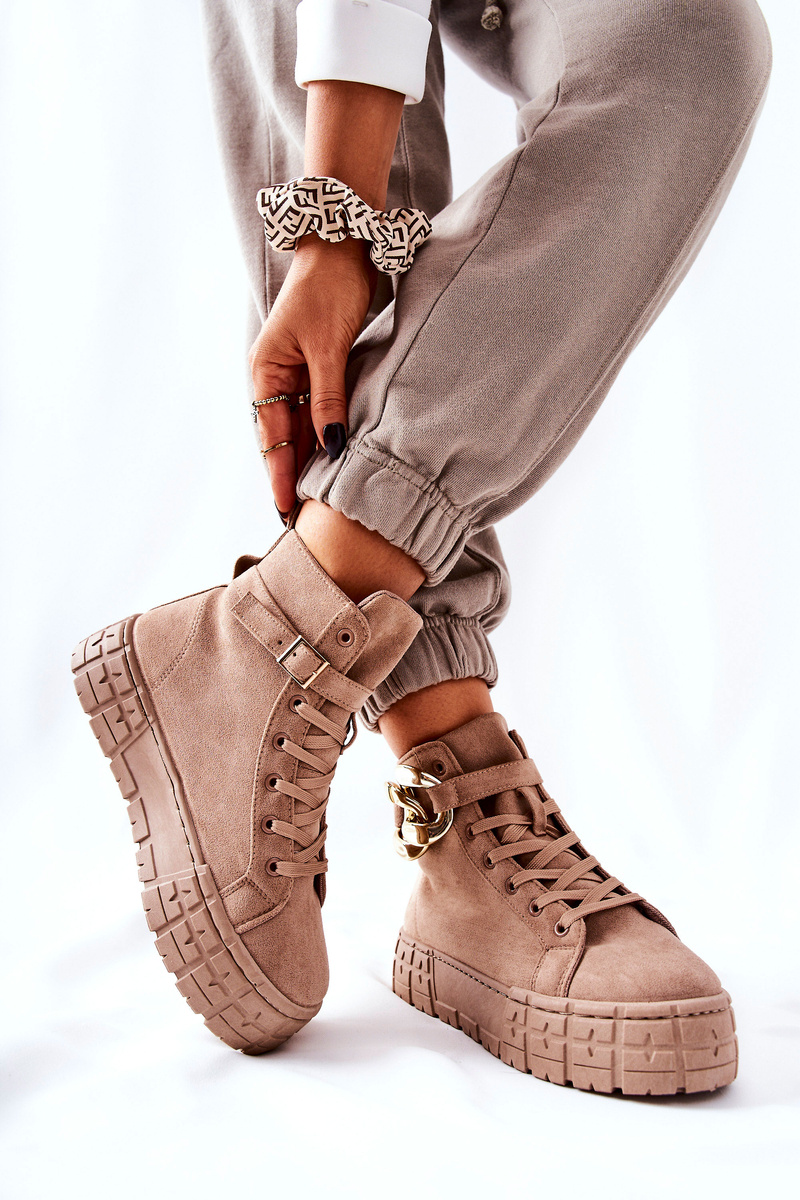 Boty byly vyrobeny ze semišové ekokůže. Vysoké tenisky mají na pásku ozdobný řetízek, který se zapíná na přezku. Lze ji také zcela odstranit. Boty mají vysokou a stabilní platformu. Vnitřní strana má látkovou stélku. Nezapomeňte se podívat na naši další nabídku platformových trenažérů! Při výběru velikosti se prosím řiďte tabulkou velikostí