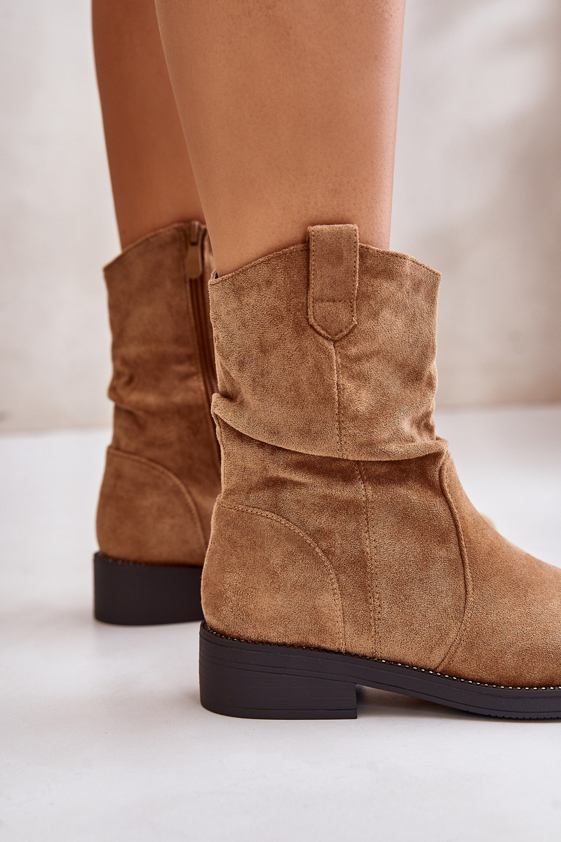 Dámské boty vyrobené z eko zamšové kůže. Na plochém podpatku. Zapínání na zip usnadňuje obouvání a zajišťuje dokonalé padnutí. Zaoblené špičky. Tento model se vyznačuje nařasením na svršku a jemnou ozdobou kolem podrážky. Při výběru velikosti se řiďte tabulkou velikostí.