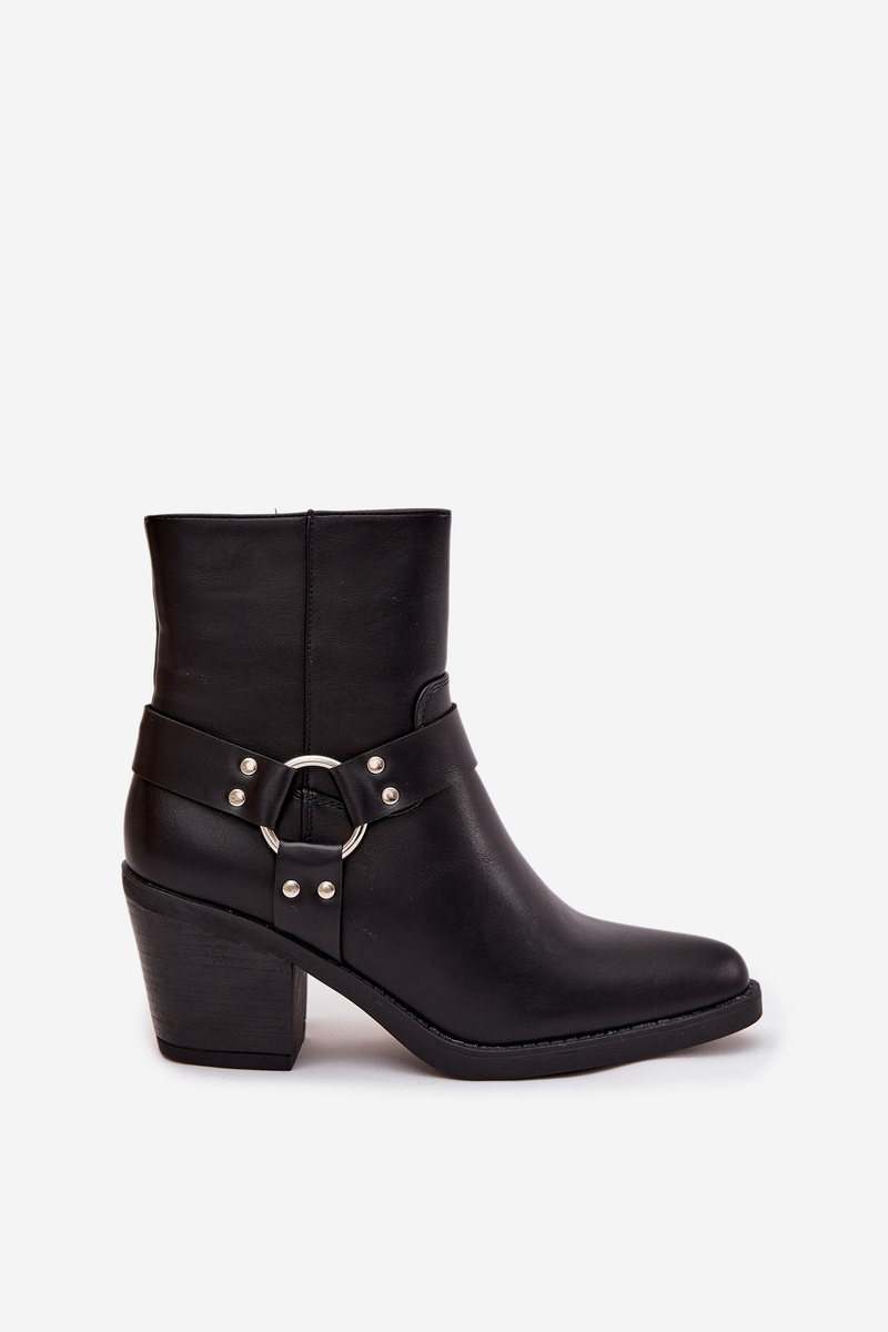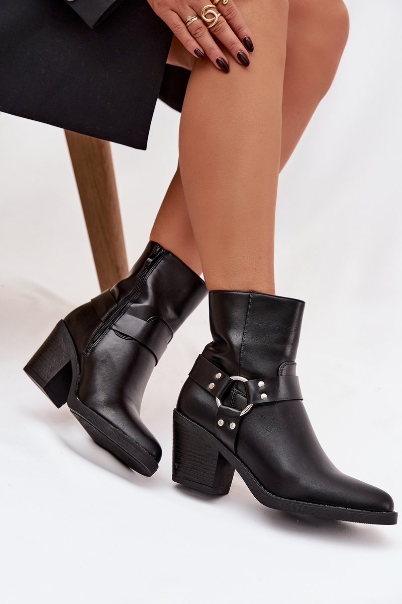 Dámské kotníkové boty z eko kůže ve stylu cowboyek. Model s stabilním, mírně zúženým podpatkem typu sloupek zajišťuje pohodlí a lehce zeštíhluje postavu. Špičky ve tvaru mandle dodávají jemnost a ženský vzhled. Boty jsou na zip, což usnadňuje jejich obouvání. Dekorativní prvek ve tvaru kolečka s pásky dodává celku výjimečný styl a upoutá pozornost. Tento model se skvěle hodí jak k casualovým stylům s džínami, tak k elegantnějším outfitům s boho šaty. Při výběru velikosti se řiďte tabulkou velikostí. Při výběru velikosti se řiďte tabulkou velikostí.